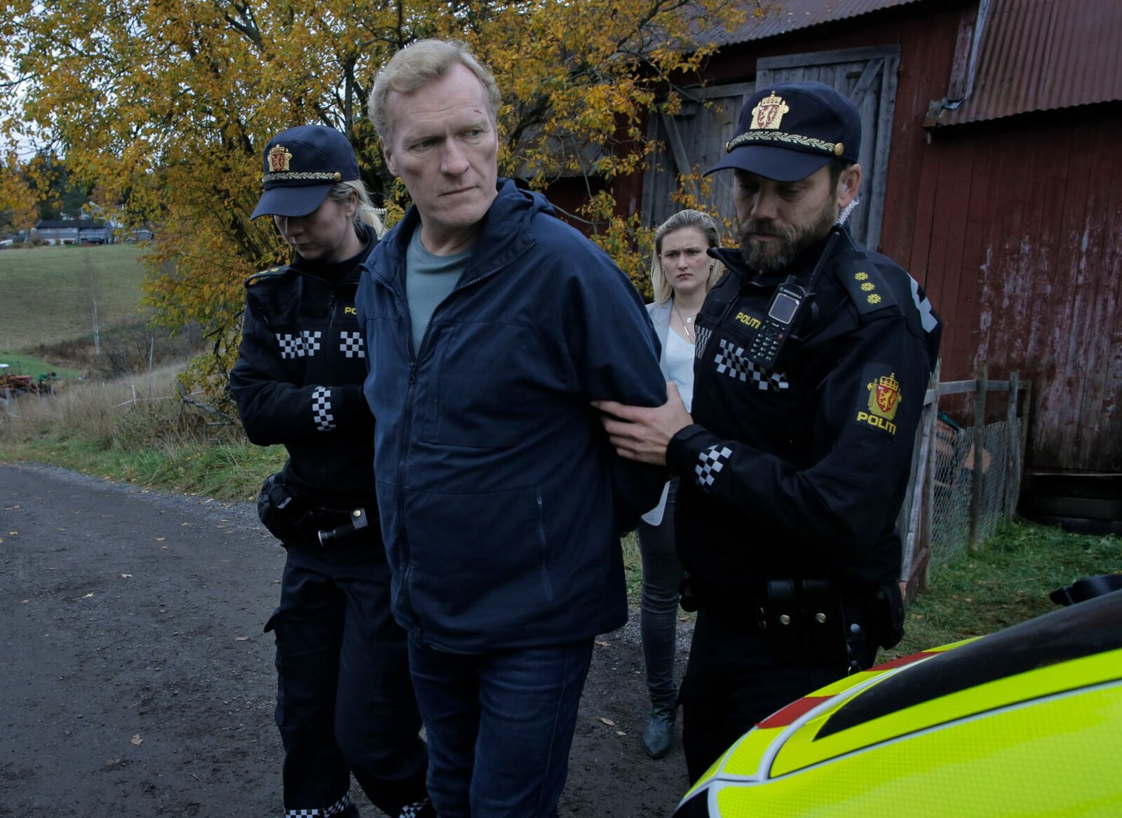 Jagdhunde (1)Wisting (Sven Nordin, vorne) wird vor den Augen seiner Tochter Line (Thea Green Lundberg) festgenommen.Bild: © WDR/Degeto