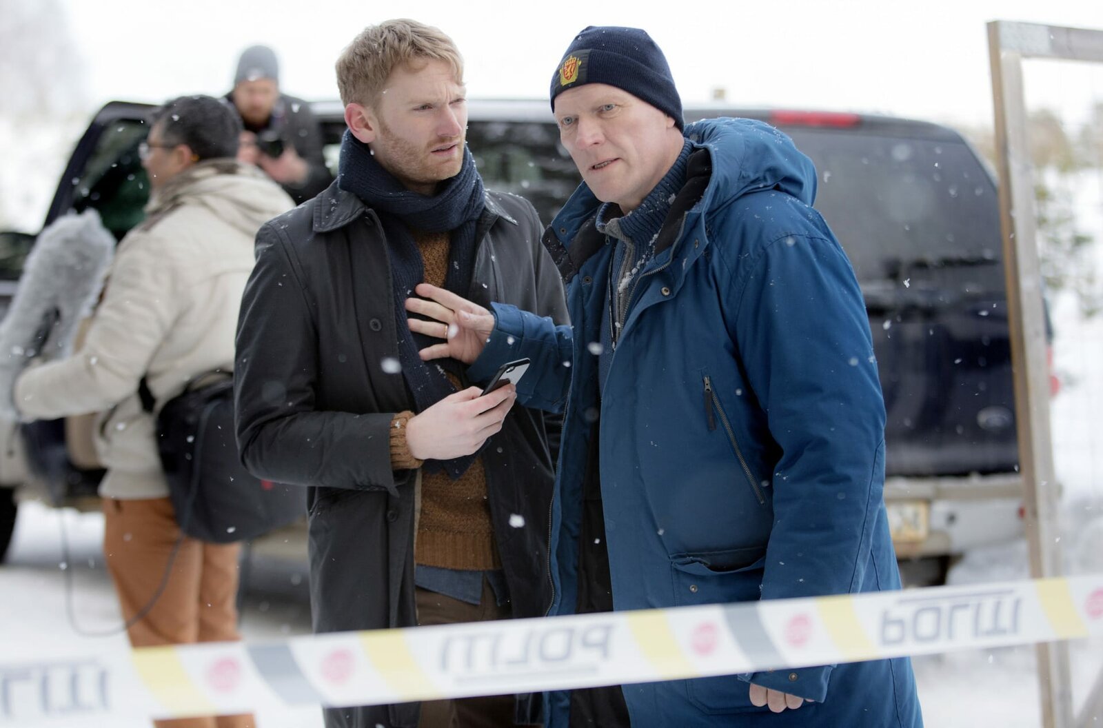 Eisige Schatten (2)Wisting (Sven Nordin) muss die Fragen eines Reporters abblocken.Bild: © SWR/ARD Degeto/Wisting Production A/S/Agnete Brun