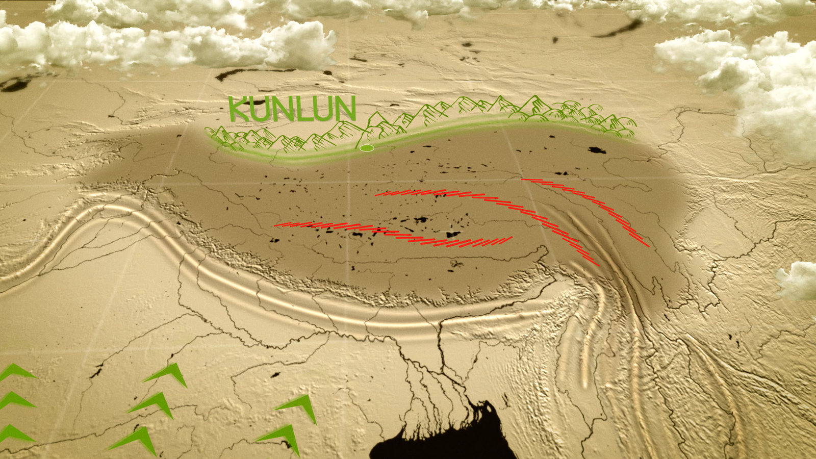 Asien heuteInsbesondere die chinesische Gebirgsregion Kunlun Shan leidet noch heute unter den Folgen der Kontinentalbewegungen.Bild: © ARTE France / © La Compagnie des Taxi-Brousse