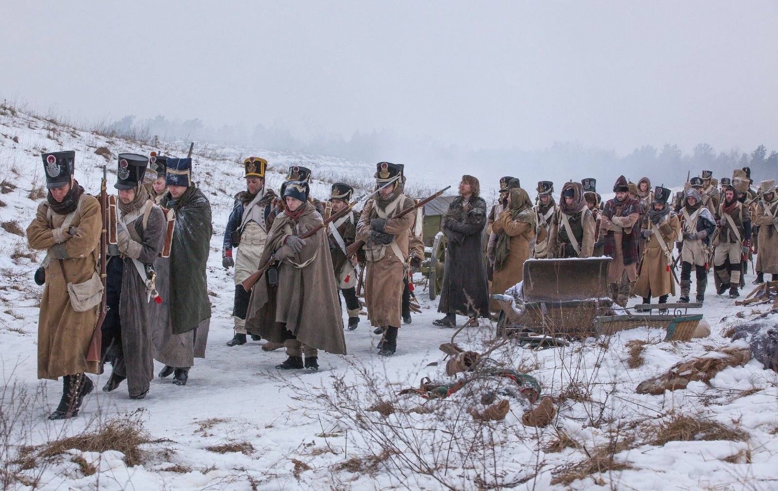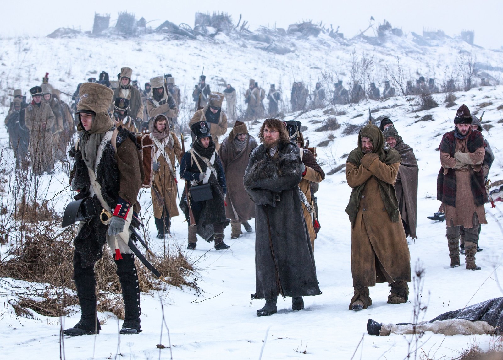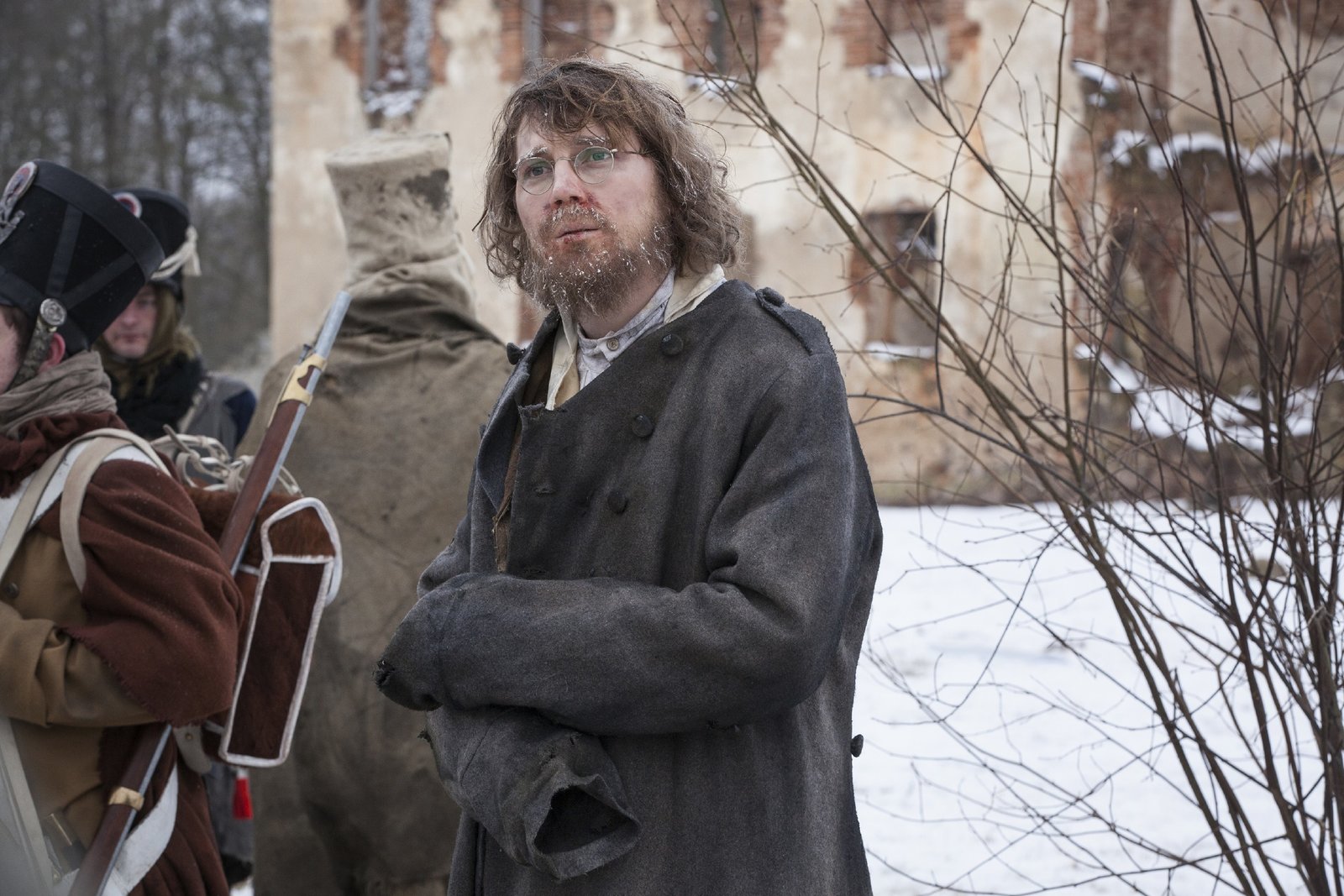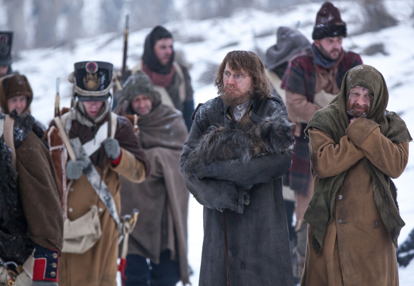 ErkenntnissePierre (Paulo Dano, M.l.), Platon Kerataev (Adrian Rawlins, M.r.)Bild: © RTL Passion / BBC