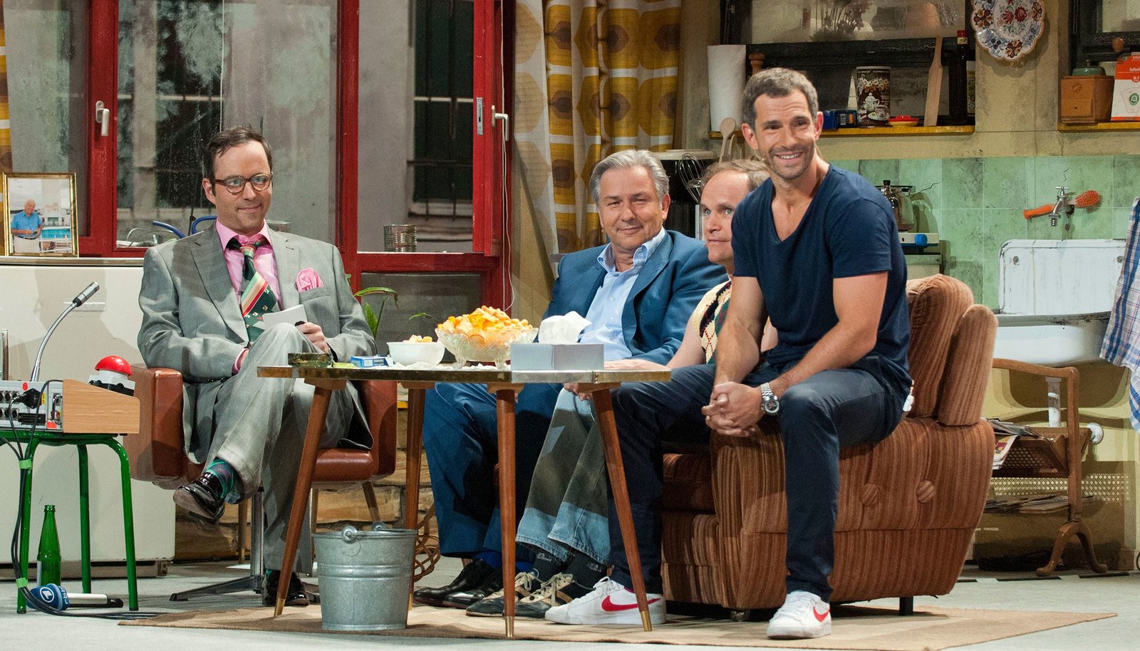 Hans Sigl, Mando DiaoKurt Krömer lädt ins Berliner Ensemble zur neuen Staffel der "Krömer - Late Night Show". - Kurt Krömer (li.) mit seinen Gästen: Schauspieler Hans Sigl (hinten), Björn Dixgård und Gustaf Norén (re.) von der schwedischen Rock-Band "Mando Diao"Bild: © rbb/Max Kohr