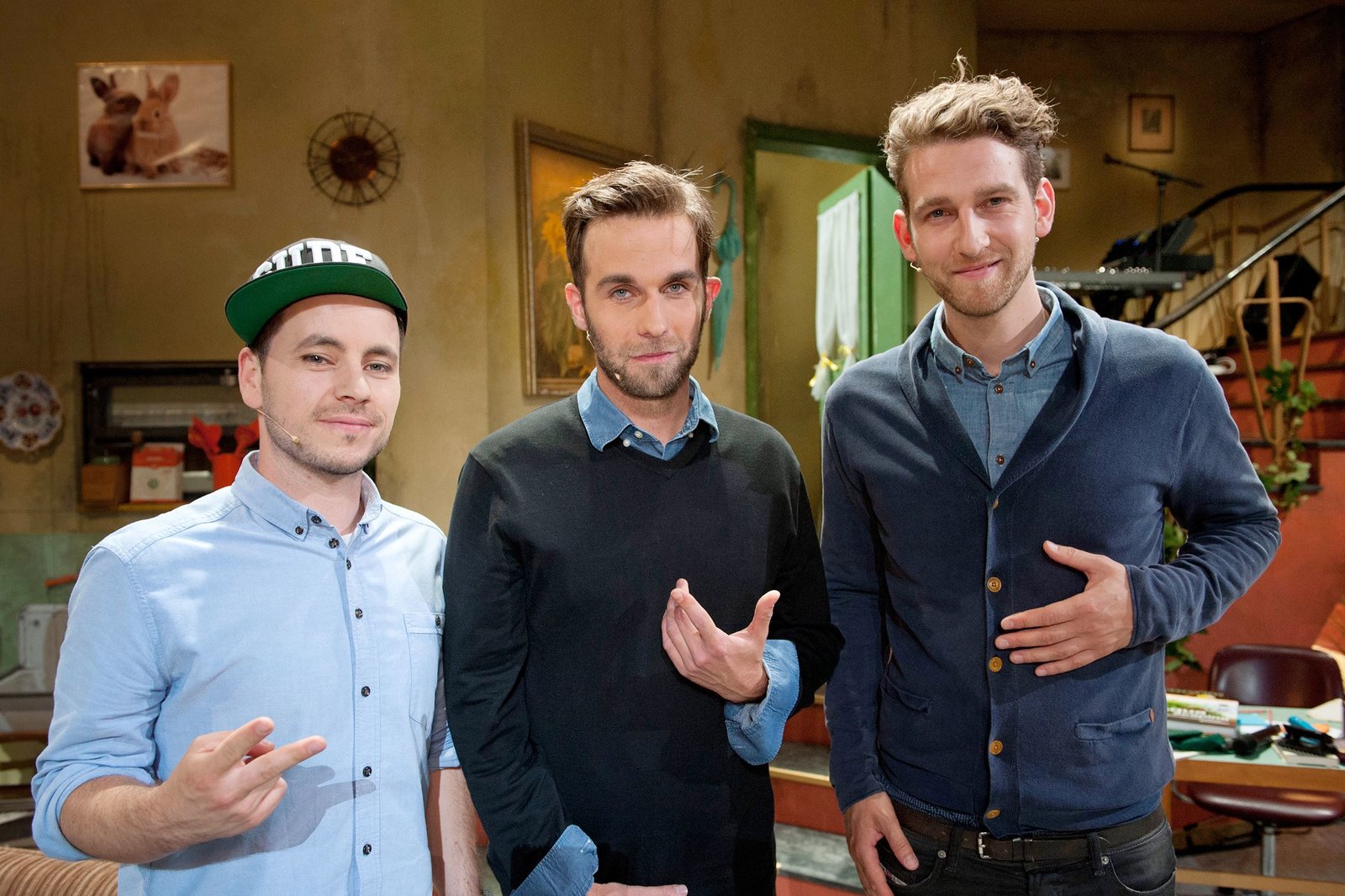 Wilson Gonzalez Ochsenknecht, Oliver Knott, OK KidDie Band OK Kid (v. li. Raffi, Jonas Schubert, Moritz Rech) zu Gast bei Kurt Krömer.Bild: © rbb/Max Kohr