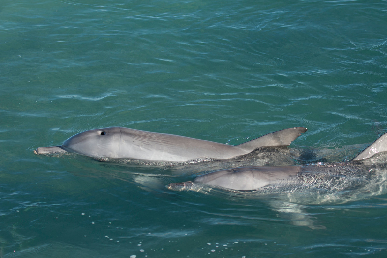 • Zwei gemeinsam schwimmende Delfine: Mutter und Delfinkalb. Luftlöcher und Rückenflossen sind bei beiden über der Wasserlinie.