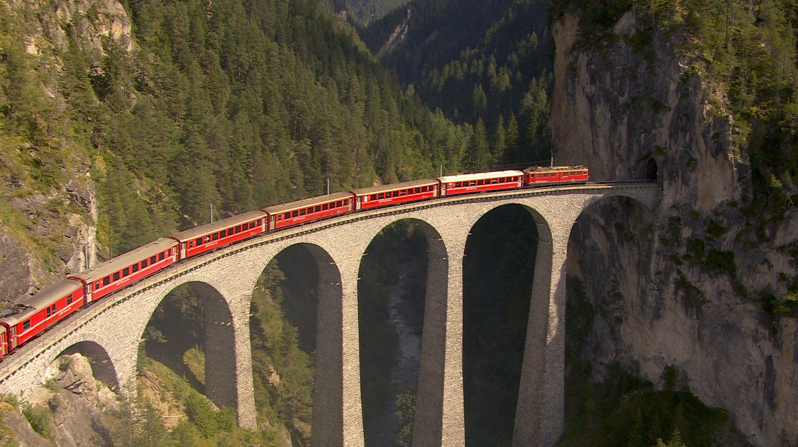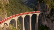 • Das Postkarten-Motiv der Albula-Linie. In 65 Metern Höhe überquert das Viadukt eine Schlucht und endet an einem Tunneleingang in luftiger Höhe.