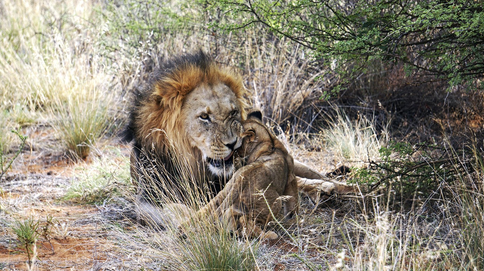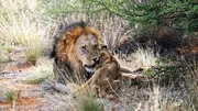 Besonders groß und mit einer prächtigen dunklen Mähne sind die Löwenmännchen in der Kalahari die wahren Könige der Halbwüste.