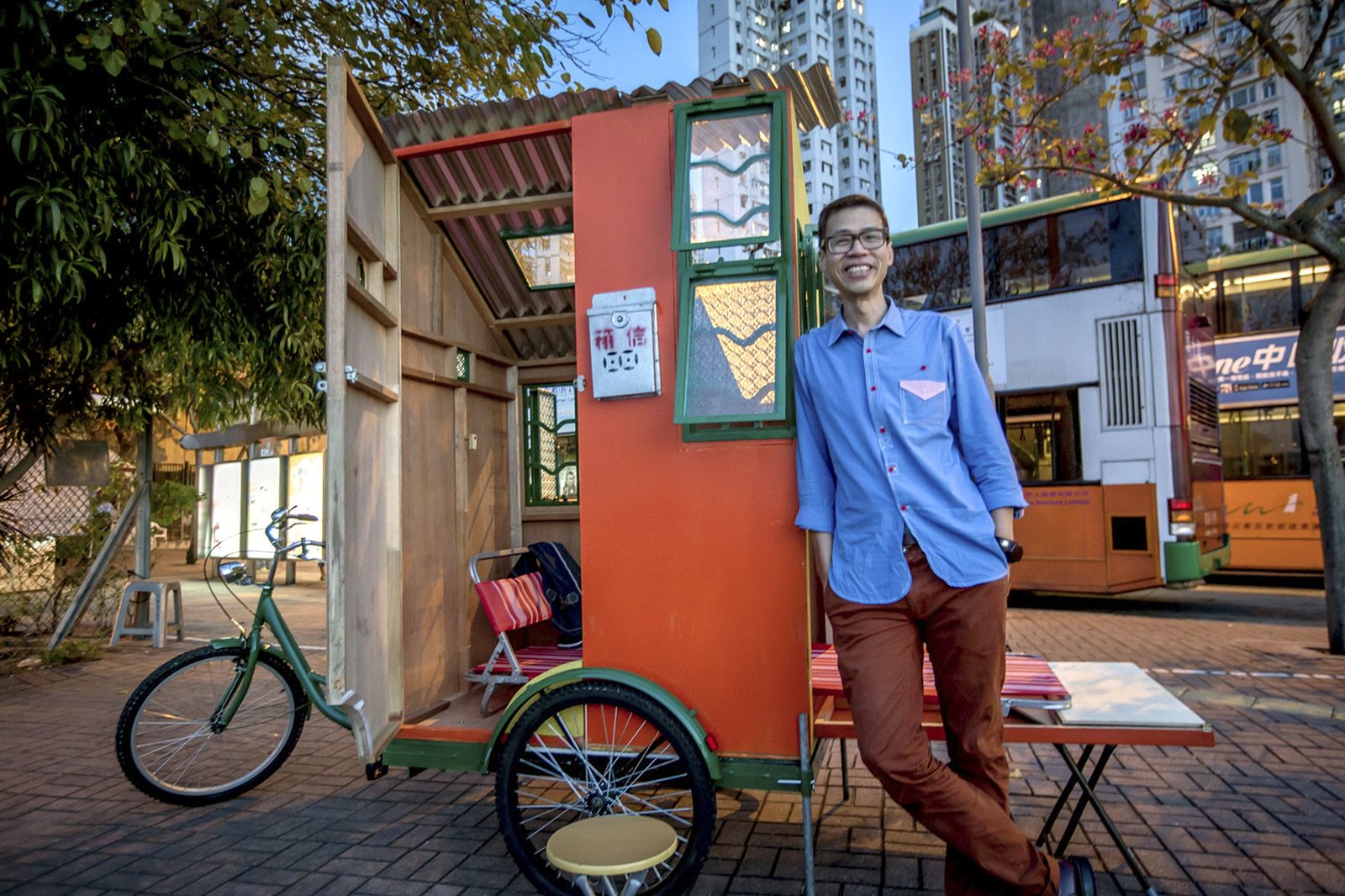 Das fahrende Häuschen ist für Performancekünstler Kacey Wong die Antwort auf den Wohnungsmangel in Hongkong.Bild: © SWR/Axel Schneppat