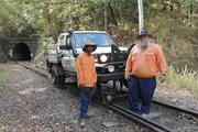 Les und Ivan räumen die Gleise nach Stürmen frei: Mit einem skurrilen Gefährt, das auf Schienen wie auf Straßen fahren kann.Bild: © NDR/WildBear Entertainment