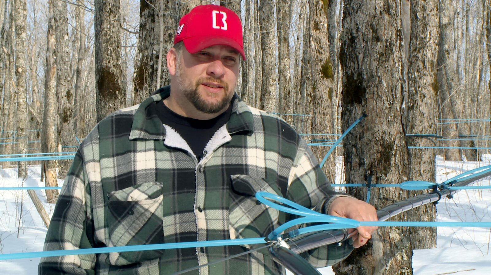 Kanadas deutsche Küste - New Brunswick und die Bay of FundyAhornsirup ist die Spezialität Kanadas schlechthin. Richard Tryde hat ein riesiges Netz aus blauen Plastikschläuchen im Ahornwald seiner Familie gespannt und erntet direkt aus den Bäumen: Der Sirup läuft von ganz allein.Bild: © NDR/Fundy Media Inc.