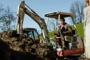 Bergbauer Peter Astl der 5. und Sohn Peter Astl 6. baggern den Mist in die Güllegrube, wo er mit Wasser verdünnt über die Rohre auf die steilen Wiesen gepumpt wird.Bild: © Njela-Valentina Pichl / ORF / Stefan Pichl