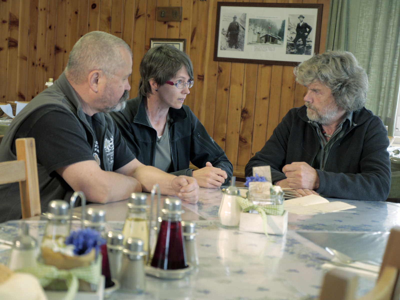 Duell am GipfelReinhold Messner mit der Historikerin Sigrid Wisthaler und Hugo Reider, dem Wirt der Dreizinnenhütte, in den Dolomiten.Bild: © ORF III