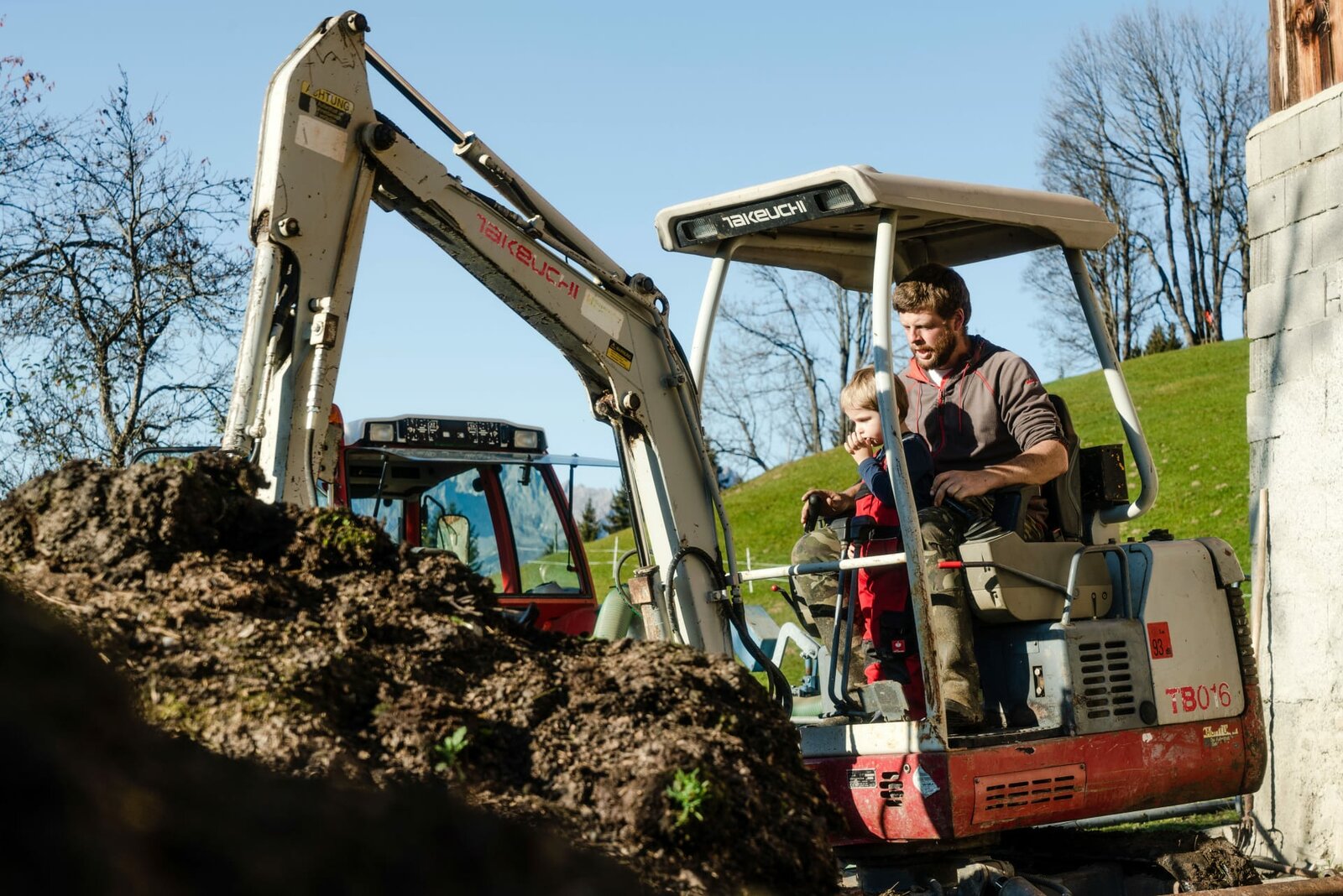 Bergbauer Peter Astl der 5. und Sohn Peter Astl 6. baggern den Mist in die Güllegrube, wo er mit Wasser verdünnt über die Rohre auf die steilen Wiesen gepumpt wird.Bild: © ORF/Epo-Film