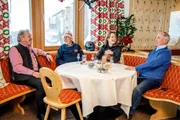 Verwallstube, l-r: Manfred Fahrner, Ferdl Nöbl, Lorraine Huber, Karl Schranz.Bild: © ORF/Epo Film/Nela Pichl