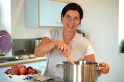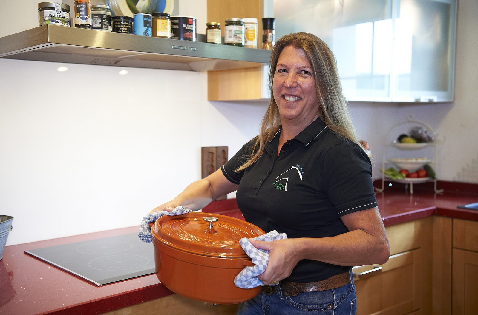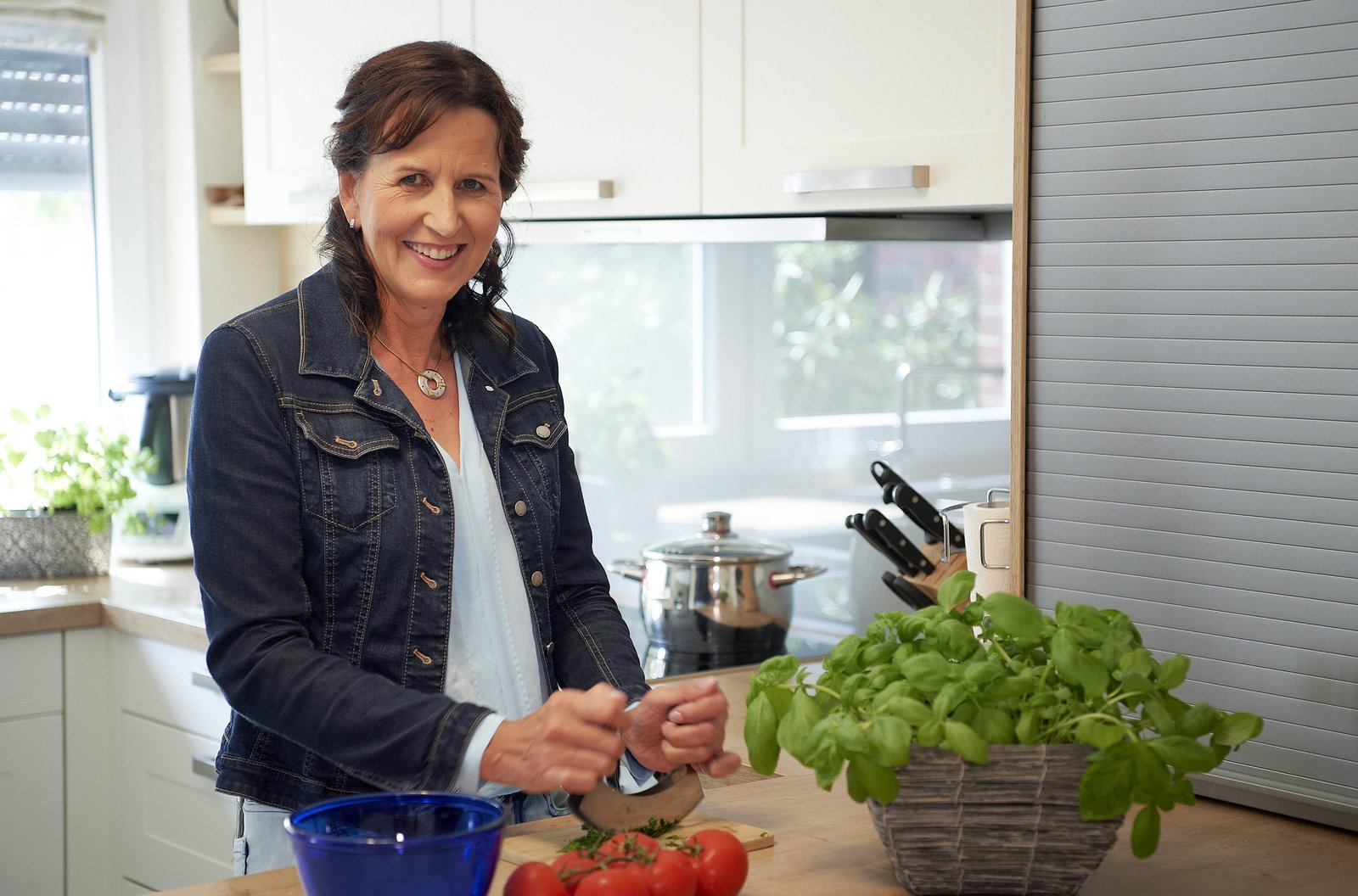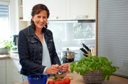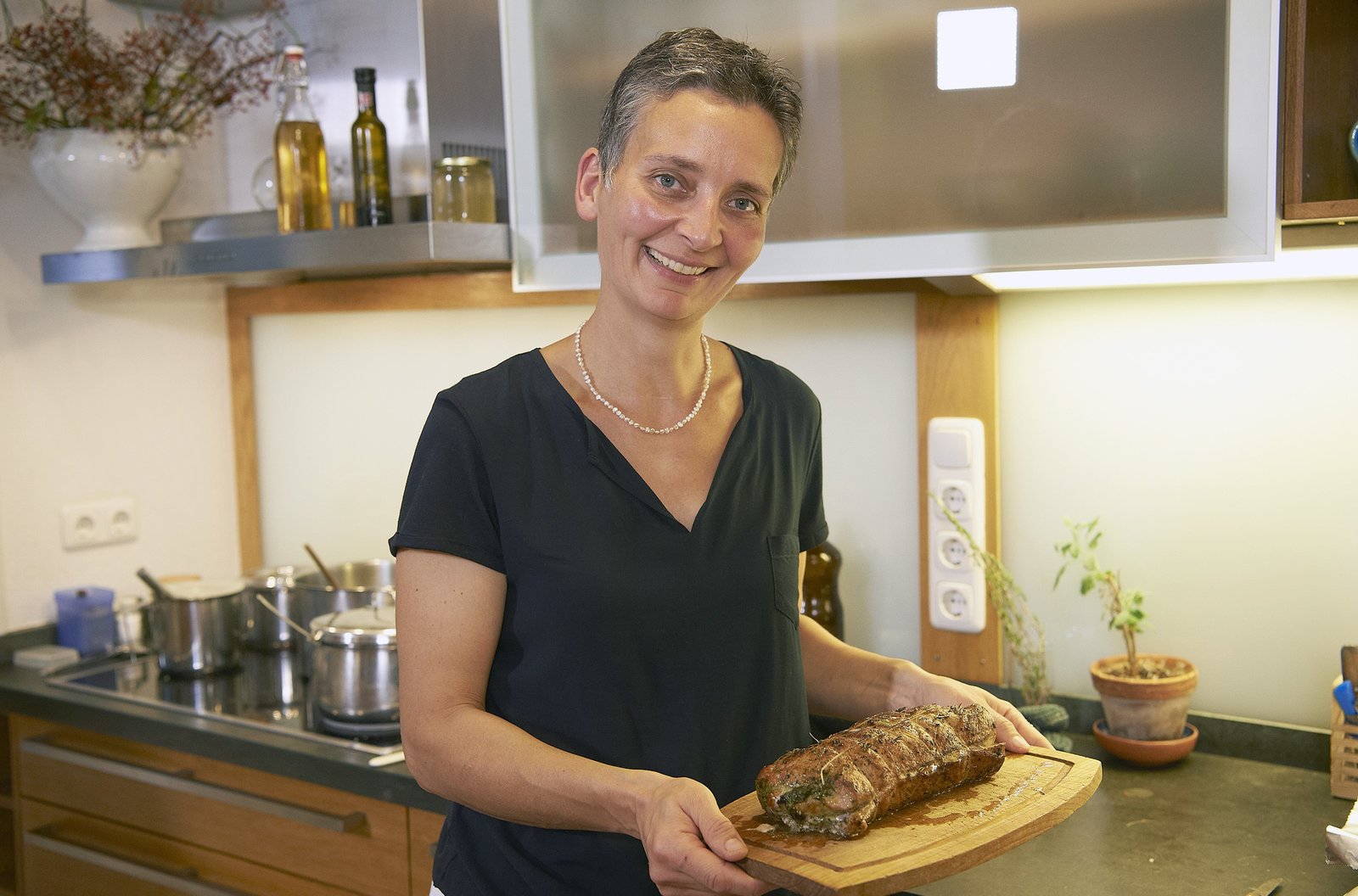Schweinegute - Geschichte von der WeserGastgeberin Jutta Sträter vom Bioland-Hof Hartmann in Beverungen. Jutta Sträter kocht leidenschaftlich gerne und möchte mit ihrem Schweinerücken bei den Landfrauen punkten.Bild: © WDR/Melanie Grande