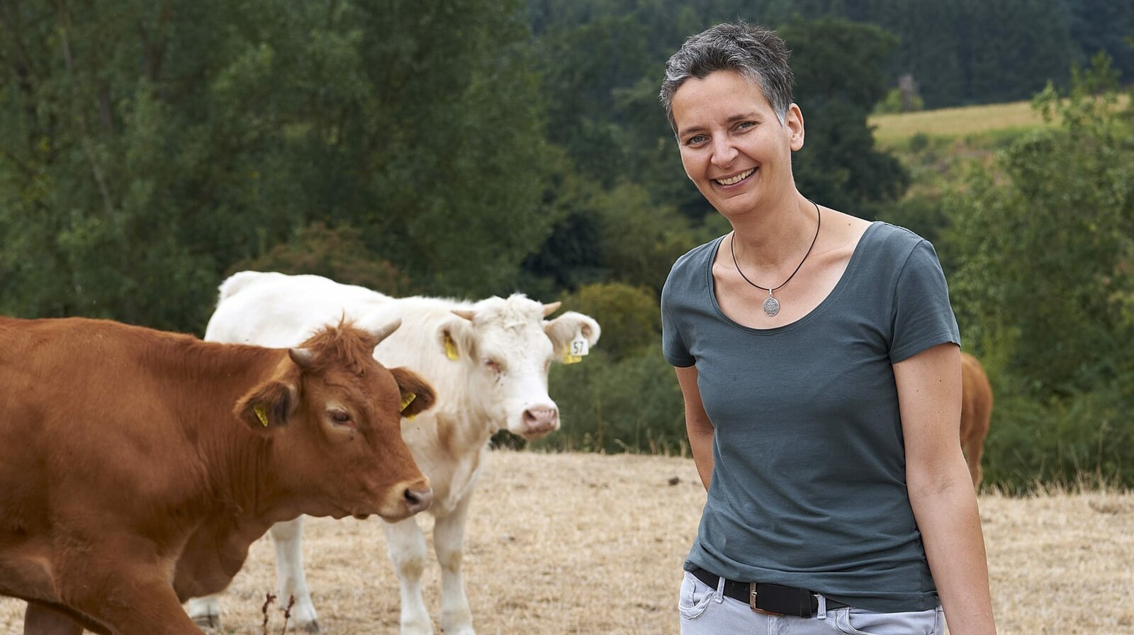 Luxus für Schweine und RinderSabine Goertz mit ihren Rindern auf dem Gahmener Hof in Lünen.Bild: © WDR/Melanie Grande