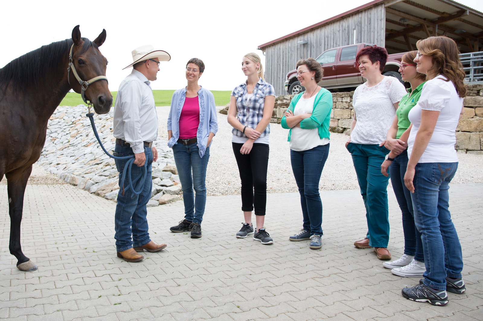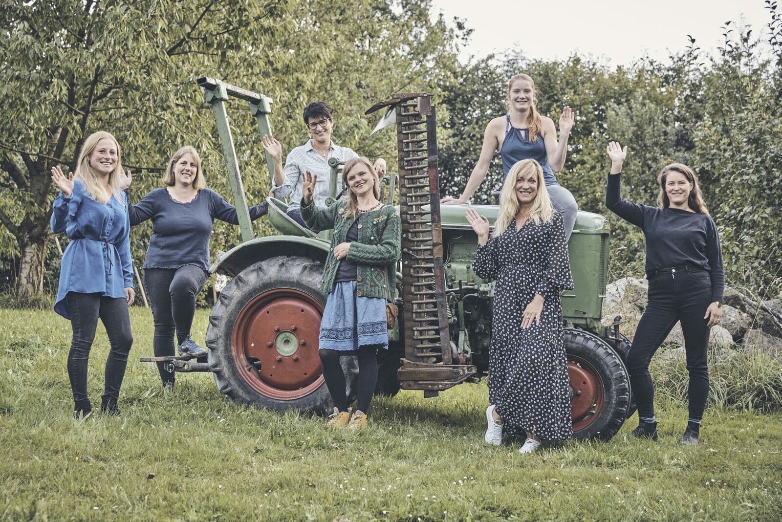 Monika Bernhard aus der OberpfalzGruppenfoto der Landfrauen vor einem Traktor. Von links: Lena Zimmermann, Anja Raithel, Karina Schwarzbauer (sitzend), Nina Wagner, Monika Bernhard (sitzend), Nicole Roth und Eva Gottschaller.Bild: © BR/megaherz gmbh/Philipp Thurmaier