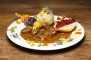 Birgit Vogl - OberpfalzHauptspeise: Rehgulasch mit Wildkräuterknödel und buntem Kartoffelspieß.Bild: © BR/megaherz gmbh/Andreas Maluche