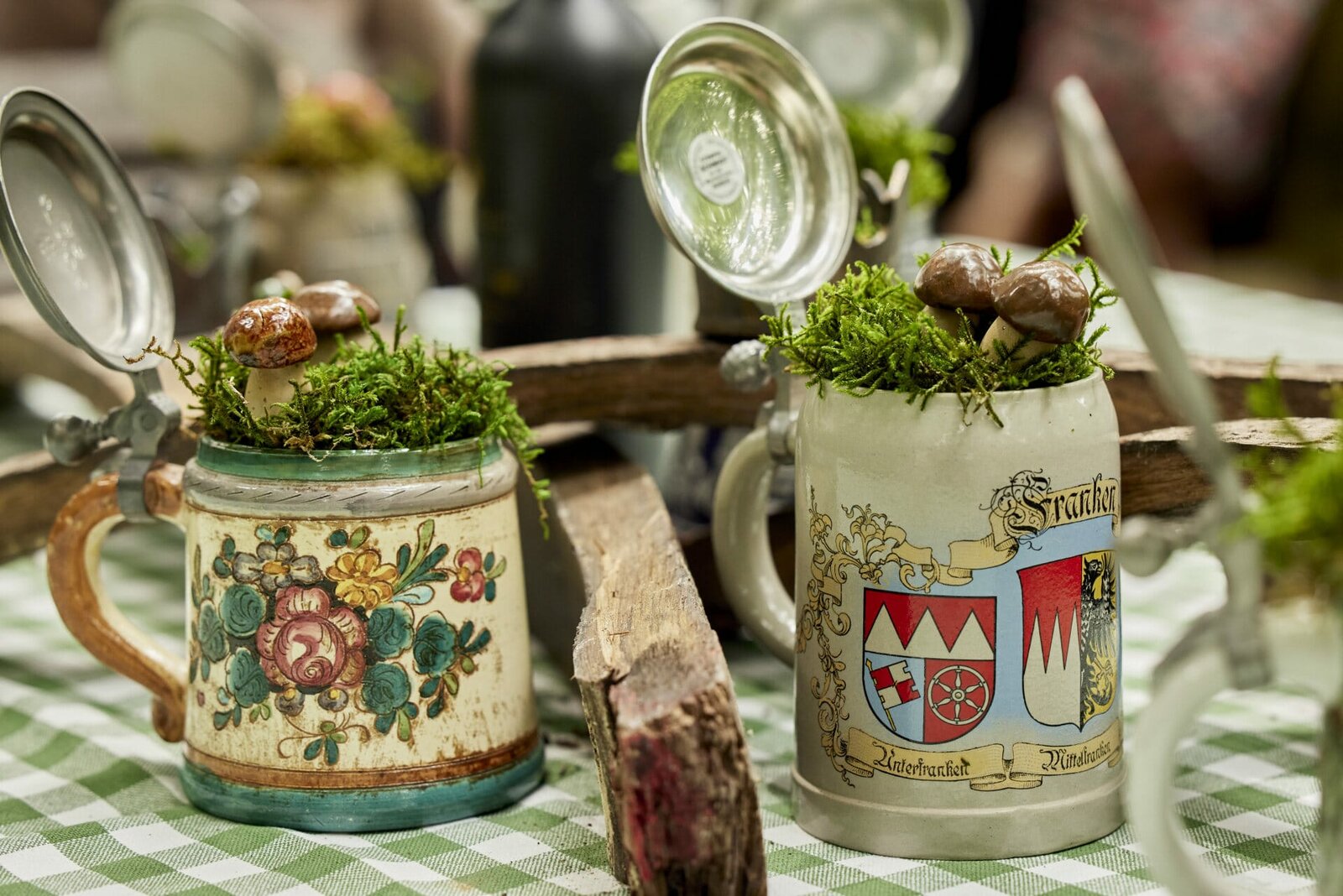 Isabella Mereien aus OberfrankenDie Tischdekoration: Alte Bierkrüge mit Moos und Porzellanpilzen.Bild: © Philipp Thurmaier / BR, megaherz gmbh / BR/megaherz gmbh/Philipp Thurmaier