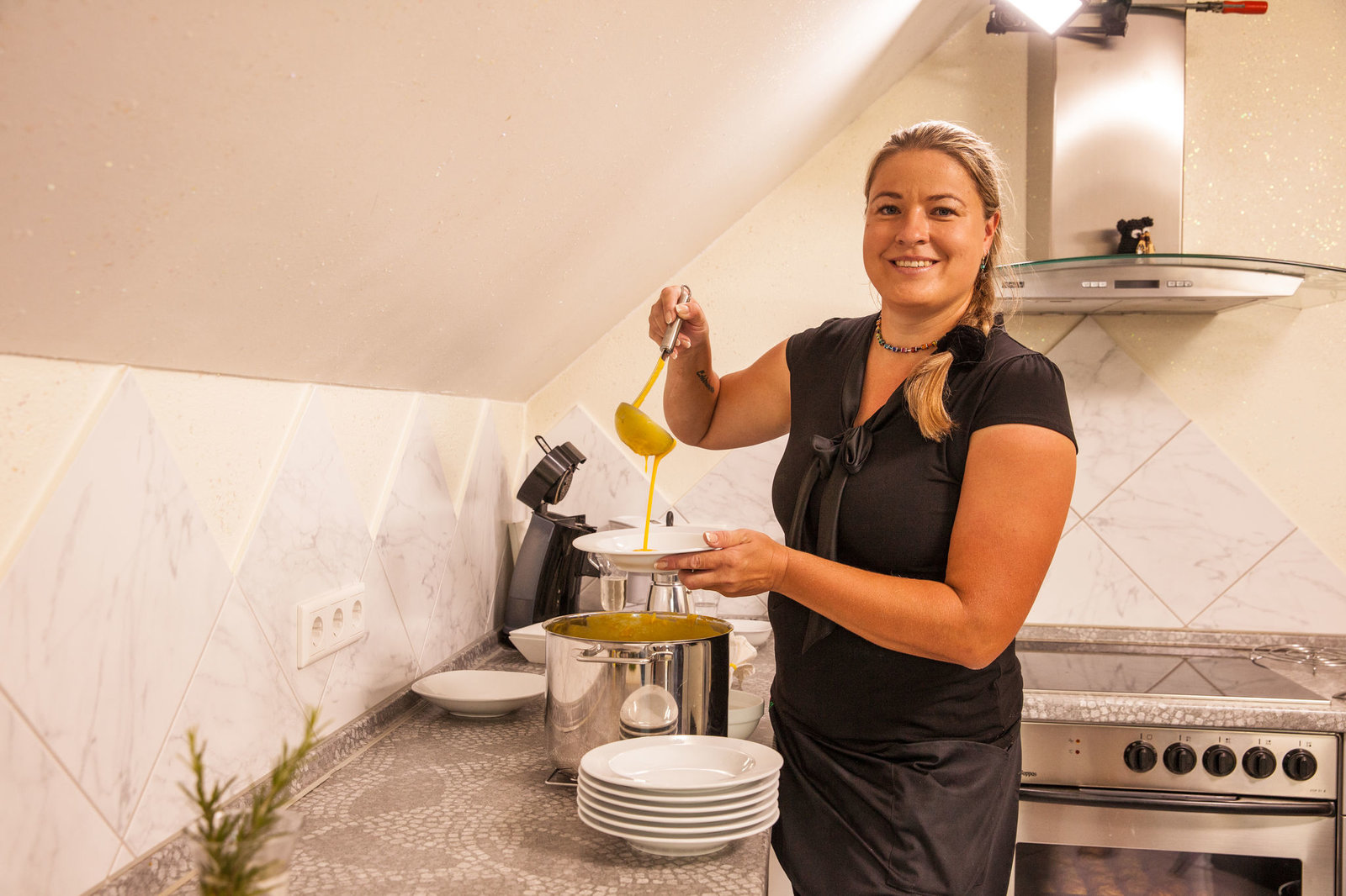 Heidi Kaiser - OberfrankenHeidi Kaiser richtet Kürbissuppe an.Bild: © Moritz Sonntag / BR;megaherz gmbh / BR/megaherz gmbh/Moritz Sonntag