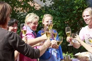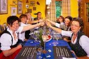 Renate Höfler - MittelfrankenGemeinsames Anstoßen der Landfrauen am Tisch - von links: Barbara Birkholz, Marie Bauer, Gerlinde Schreyer, Irmi Kinker, Maria Deß und Joanna Kantorowicz.Bild: © BR/megaherz gmbh/Andreas Maluche