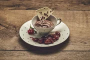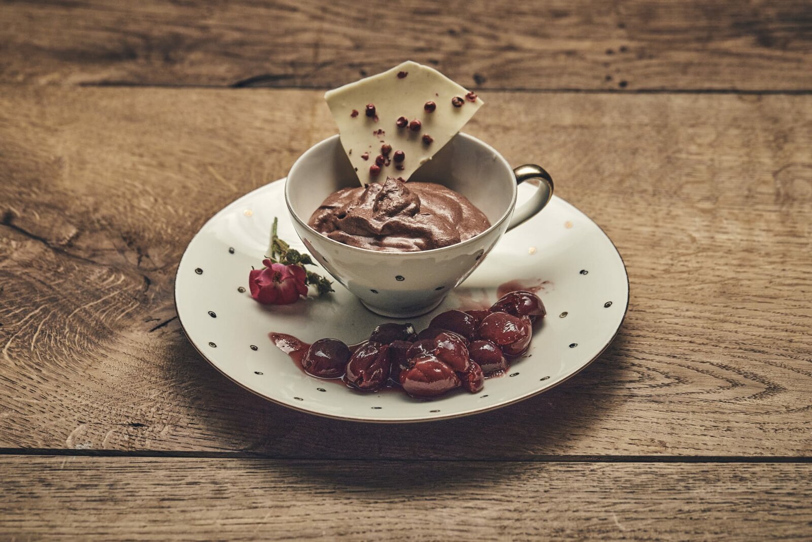 Eva Gottschaller aus NiederbayernDie Nachspeise: Mousse au Chocolat auf Basis von Aquafaba mit Pfeffer-Splitter an Garten Kirschen.Bild: © BR/megaherz gmbh/Philipp Thurmaier
