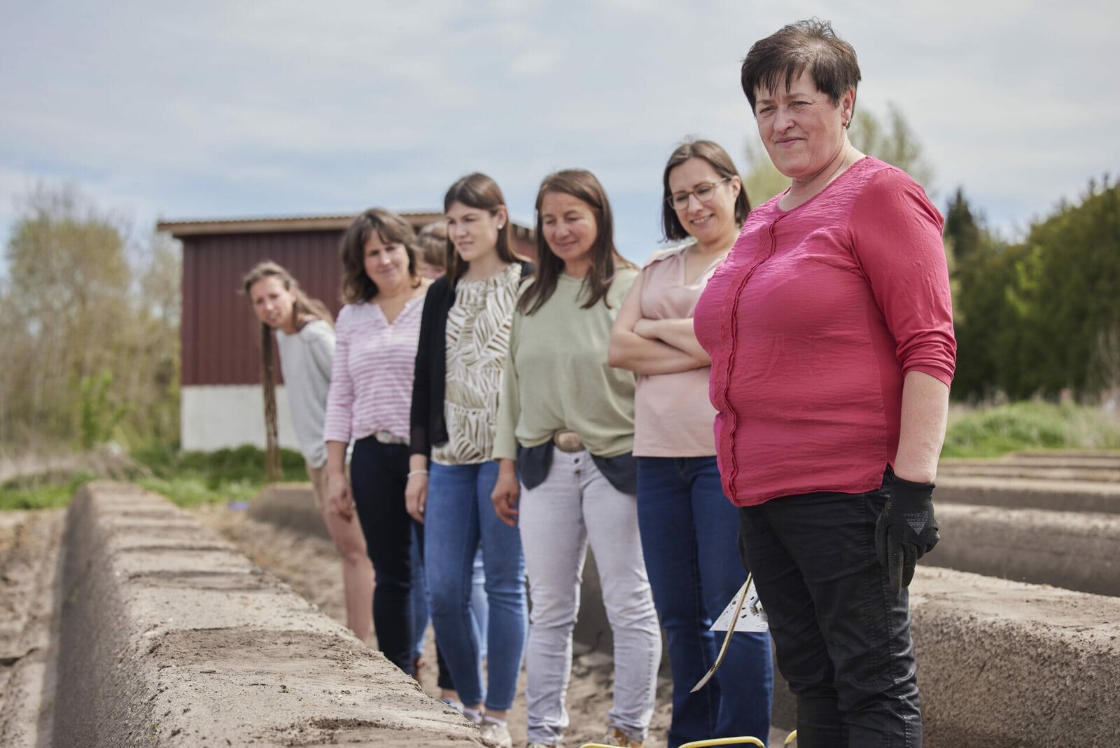 Veronika Röll aus NiederbayernVon vorne: Veronika Rölls Mutter Sieglinde und die Landfrauen Isabella Mereien, Fini Reißaus, Carolin Meyer, Tanja Zeller, Katharina Lerf (verdeckt) und Julia Hausladen bei der Hofführung auf dem Spargelfeld.Bild: © Philipp Thurmaier / BR, megaherz gmbh / BR/megaherz gmbh/Philipp Thurmaier