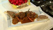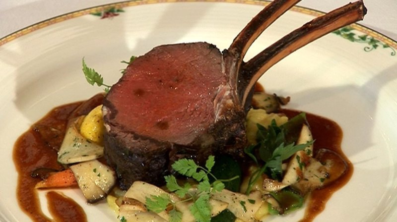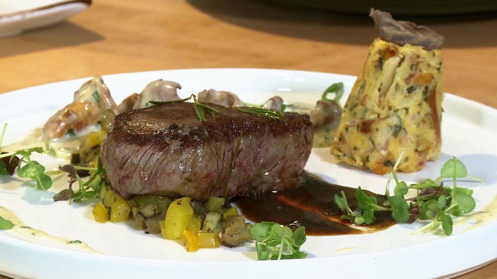 Rinderlende auf Pfifferling-Rahmsauce mit Brezn-Sauerkraut-Soufflé und Ratatouille-Gemüse, serviert im Bräustüberl Hacklberg in Passau.Bild: © B.O.A. Videofilmkunst/BR/Werner Teufl