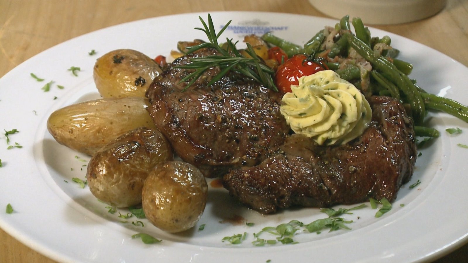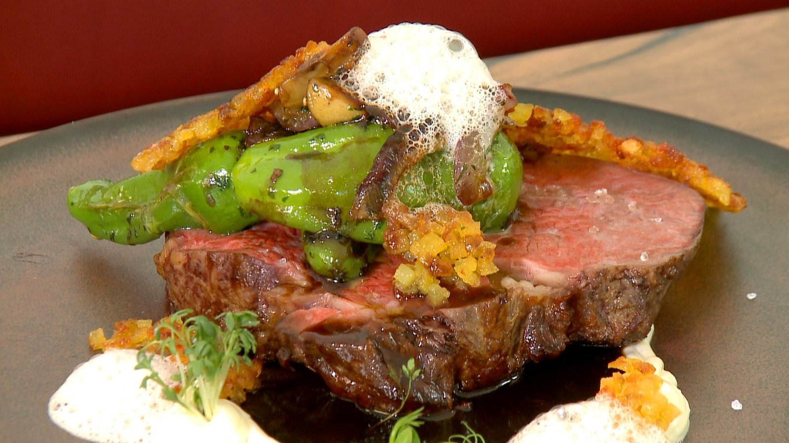 Das Gericht „Entrecôte mit Kartoffelkruste und Pimientos de Padrón“ wird im Restaurant Rauchensteiner serviert.Bild: © BR/Werner Teufl / Werner Teufl