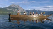Jodeln, Paschen, Geigen - So klingt das SalzkammergutDie Gruab-Musi Altmünster musiziert auf einer Plätte am Attersee.Bild: © ORF/ORF III