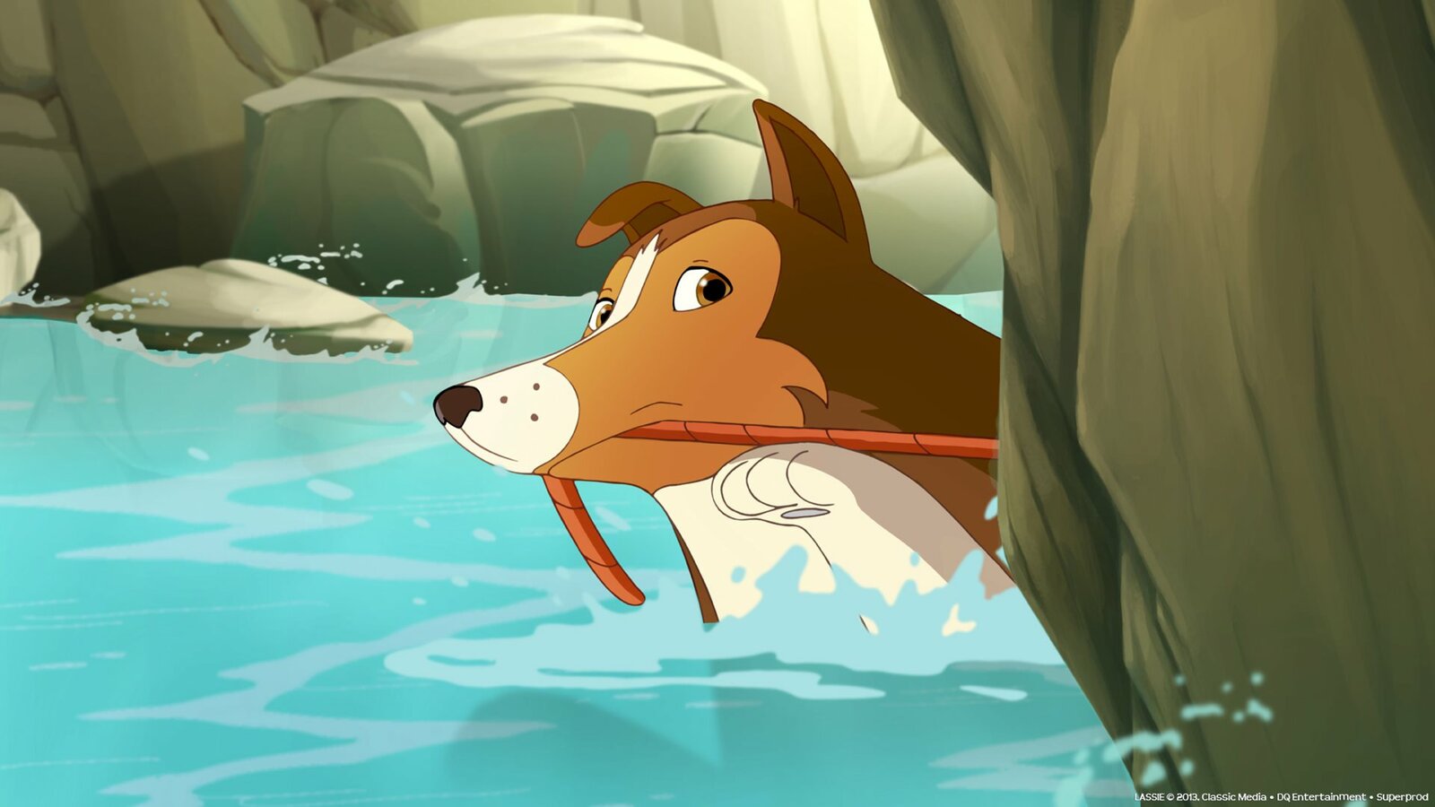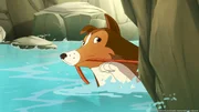 Der Biss der SpinneLassie ist ins Wasser gesprungen um das Päckchen zu retten in dem das wichtige Gegengift für Mrs. Lee ist.Bild: © ZDF und Lassie (c) 2013