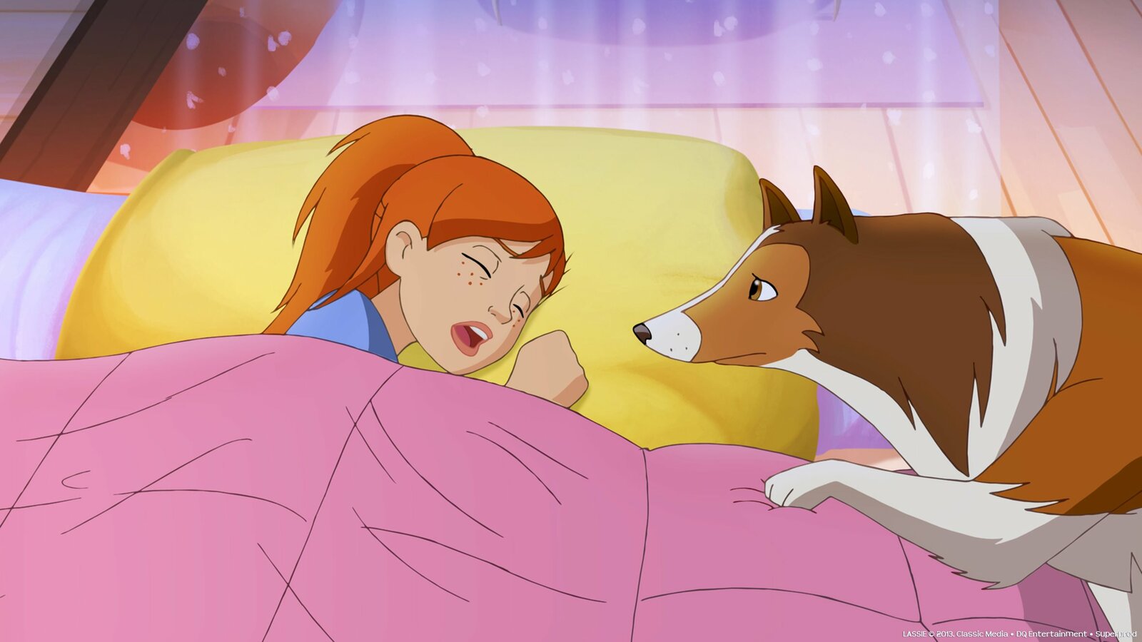 Harveys ReiseLassie versucht Zoe zu wecken um sie auf das Verschwinden von Harvey aufmerksam zu machen.Bild: © ZDF/Classic Media/DC Entertainment/Superprod