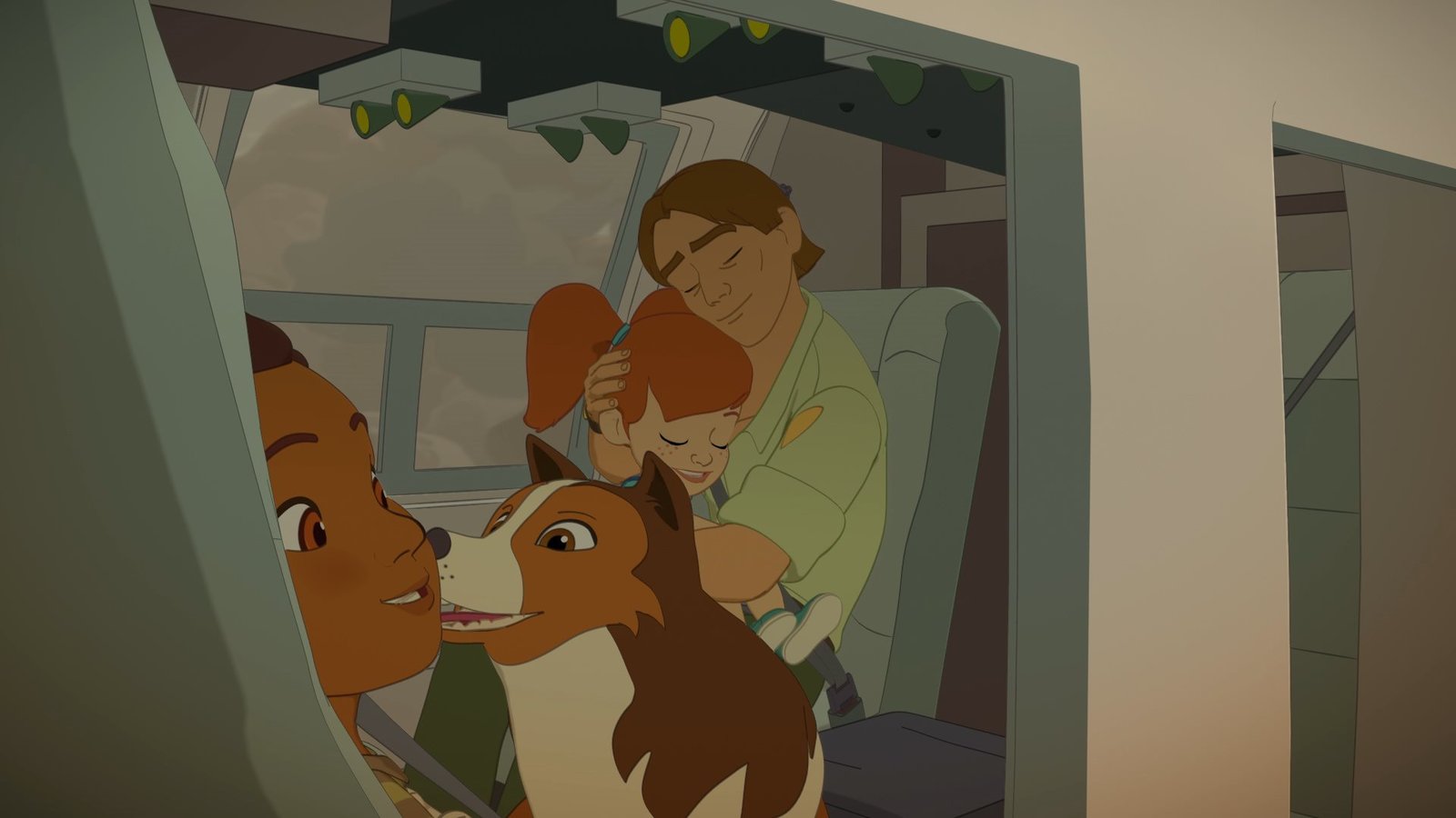 Freunde fürs Leben (2)Nachdem Graham (r.) und Harvey (l.) Zoé (M.) und Lassie gefunden haben, fliegen alle erleichtert im Hubschrauber aus der Brandzone weg.Bild: © ZDF und Superprod