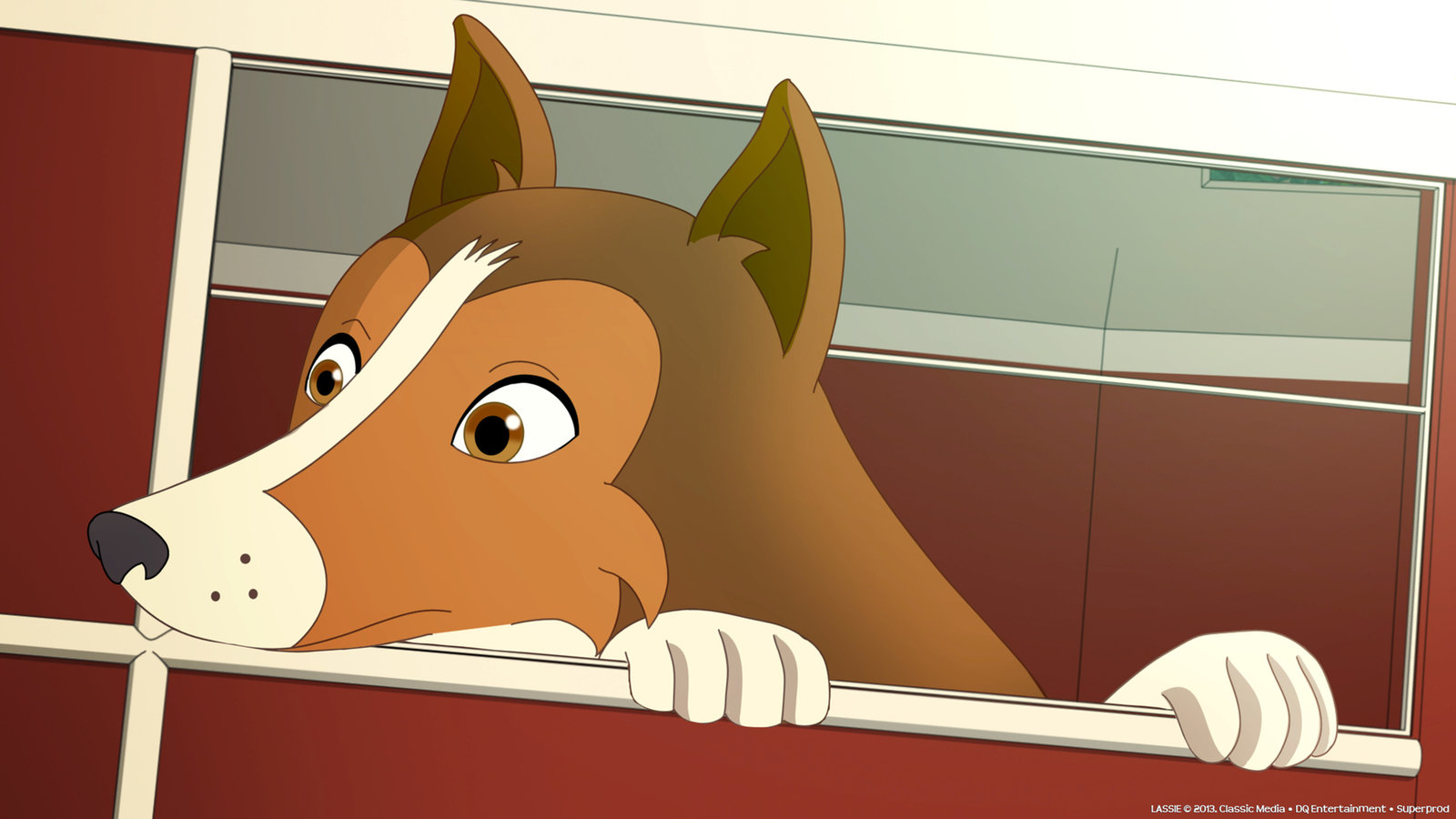 Der große Preis (1)Lassie wurde entführt und schaut nun besorgniserregend aus dem fahrenden Anhänger raus.Bild: © ZDF und 2013 DQ Entertainment . Superprod.Classic Media