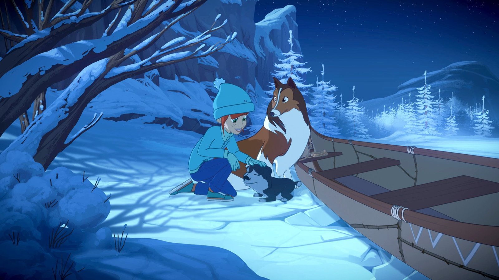 Auf eigene FaustMit Lassies Hilfe sind Zoé und das Wolfsjunge im Boot auf die andere Seite des zugefrorenen Sees gelangt.Bild: © ORF 1