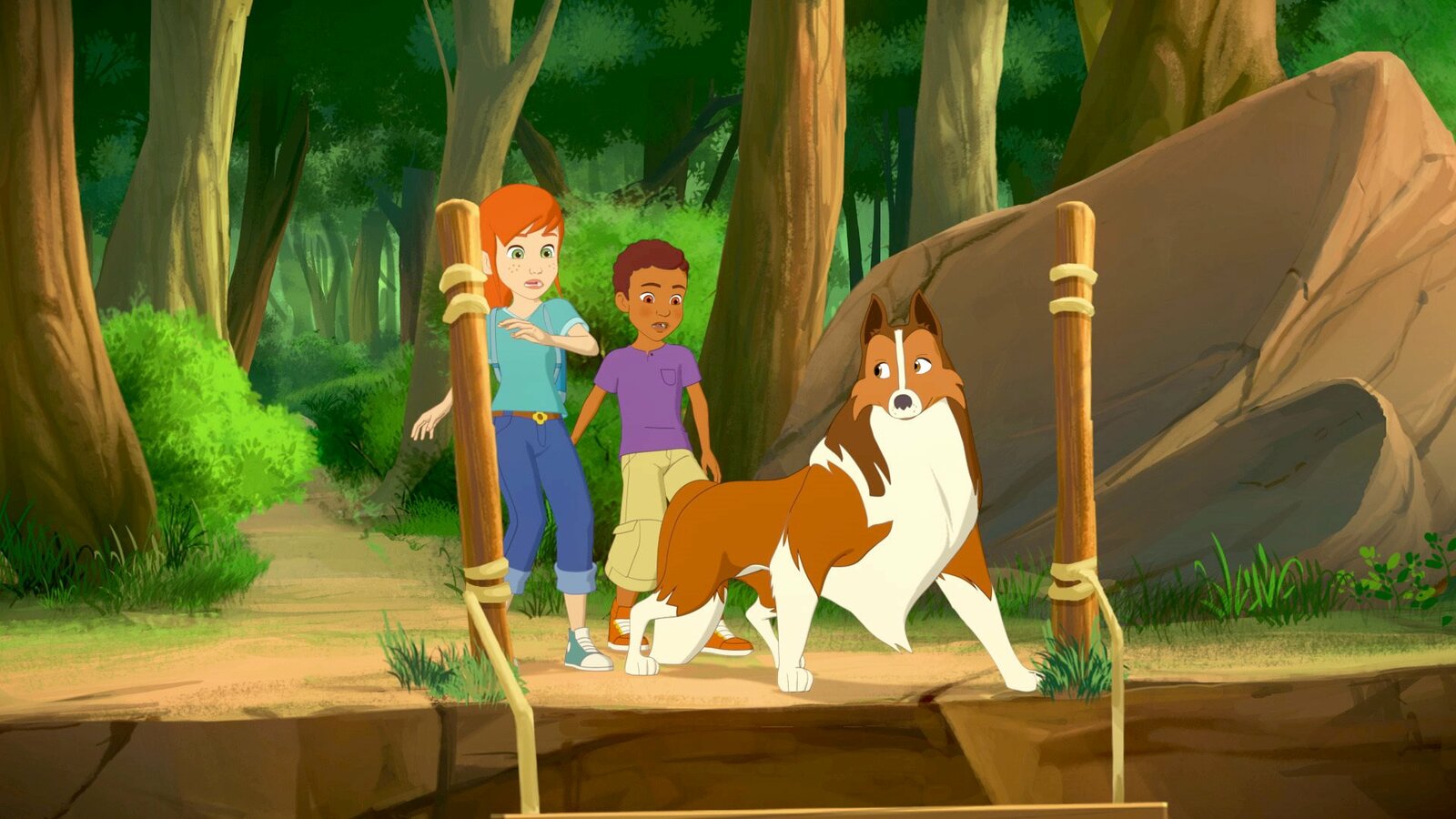 In der FalleGraham (M.), der Ranger, wurde von einem Steinbrocken eingeklemmt. Zoé (l.) und Harvey (r.) versuchen ihn zu befreien.Bild: © ZDF und Lassie (c) 2013