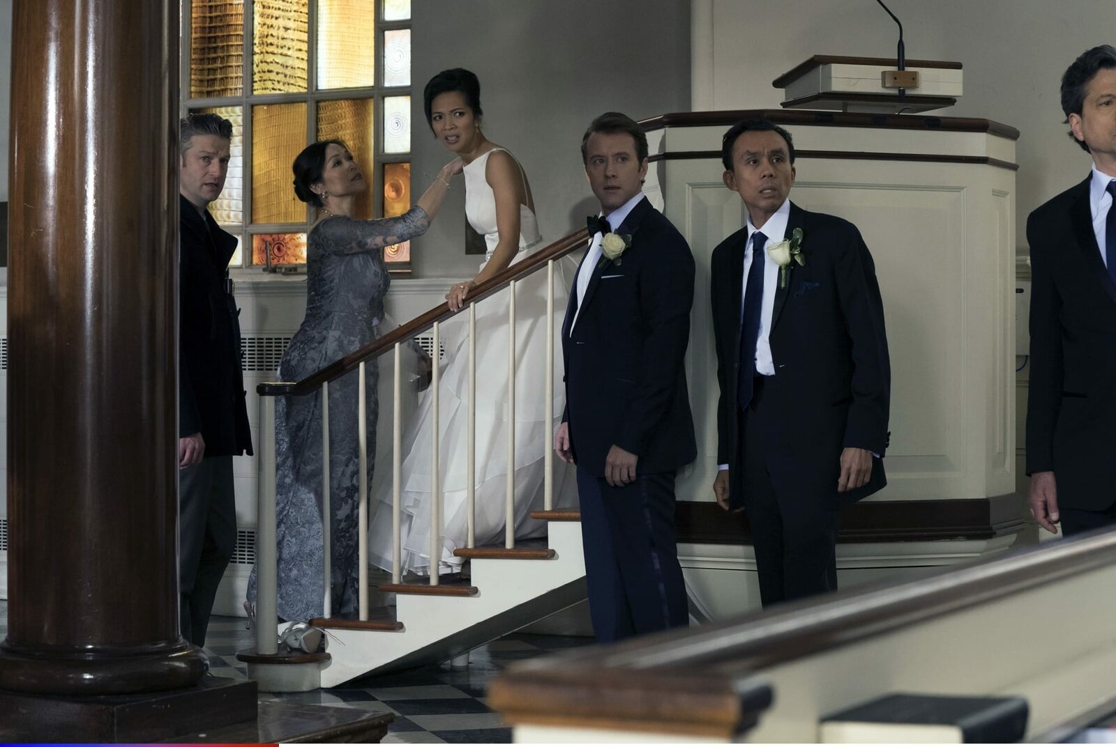 LAW & ORDER: SPECIAL VICTIMS UNIT -- "Dearly Beloved" Episode 2019 -- Pictured: (l-r) Peter Scanavino as Dominick "Sonny" Carisi, Amor Owens as Samantha Stallworth, Maureen Sebastian as Lana Stallworth, T.J. Thyne as Dr. Joshua Hensley, Ron Domingo as Bill Stallworth -- (Photo by: Virginia Sherwood/NBC)Bild: © NBC / Virginia Sherwood/NBC / Episodic / 2019 NBCUniversal Media, LLC