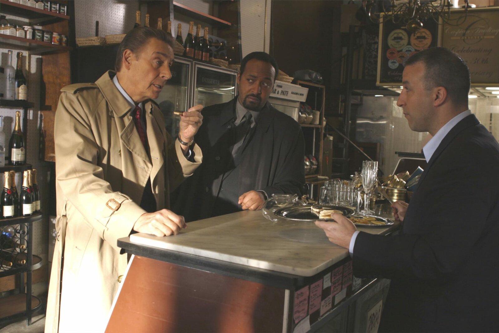 Der Tod des KaviarkönigsDet. Lennie Briscoe (Jerry Orbach) und Det. Ed Green (Jesse L. Martin) befragen Alferandi Dilmanian (Thom Christopher).Bild: © 13th Street