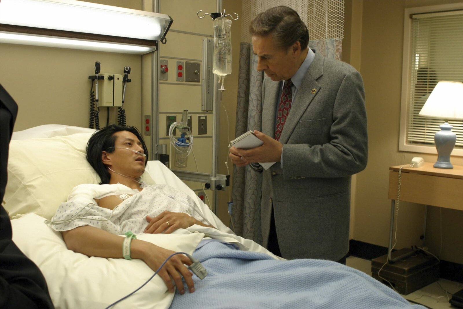 Japanische VerschwörungDet. Lennie Briscoe (Jerry Orbach, re.) verhört im Krankenhaus Hiroji Yoshida (Will Yun Lee). Dieser wurde in seinem Urlaub in New York Opfer eines Überfalls, bei dem seine Frau erschossen wird. Zurück in Tokyo macht er der Stadt große Vorwürfe und übt so Druck auf die New Yorker Behörden aus. Ist Hiroji Yoshida wirklich ein trauernder Witwer?Bild: © 13th Street
