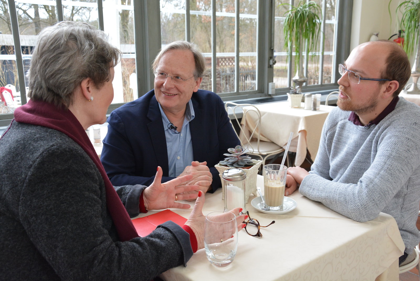 Kleine Spende - neues LebenDietrich Grönemeyer spricht in einem Café mit Margot und ihrem Lebensretter Julian über Stammzellenspenden. Was muss beachtet werden?Bild: © ZDF und Christian Schnelting