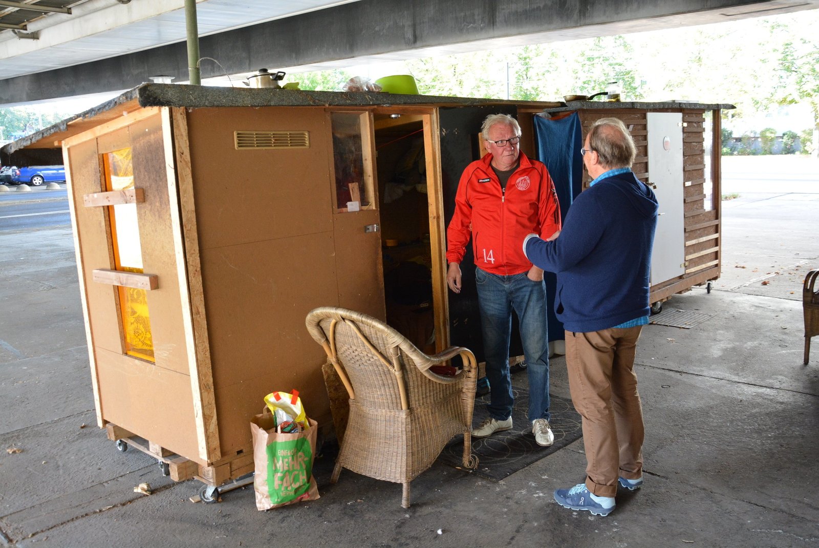 Eine letzte Chance! Hütten für ObdachloseDietrich Grönemeyer besucht den obdachlosen Henry in Berlin Pankow. Sie stehen an seiner Schutzhütte und reden.Bild: © ZDF und Christian Schnelting.