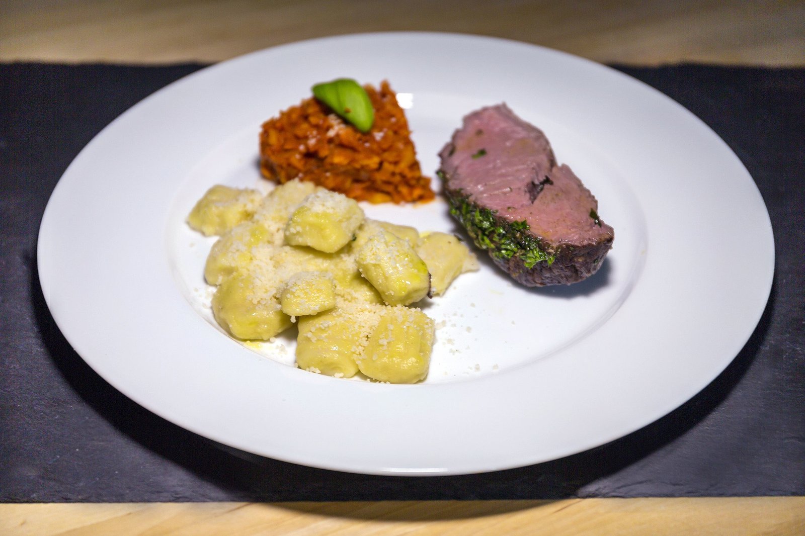 In den Saargau zu Silke FuchsenDie Hauptspeise: Rinderfilet im Kräutermantel, Gnocchi mit Käse, Möhrendip aus Karotten, Zwiebeln, Tomatenmark.Bild: © SWR/megaherz/Andreas Maluche