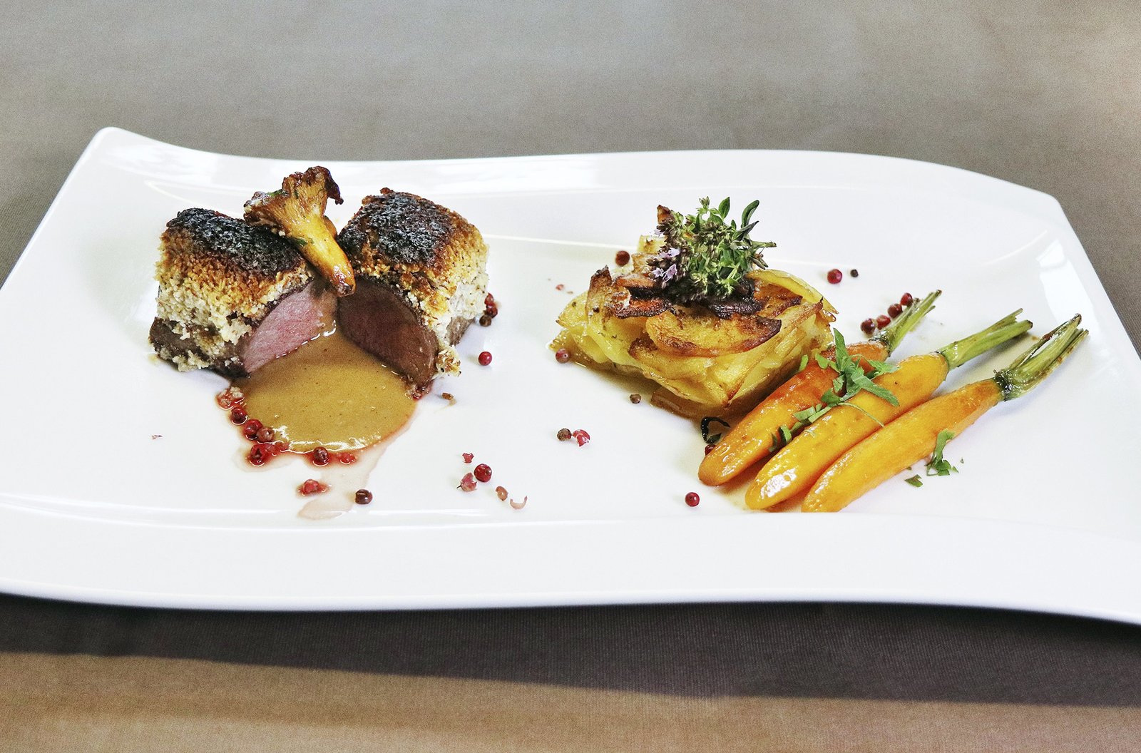 Zu Andrea Engel in den Landkreis Schwäbisch HallDie Hauptspeise: Rehrücken mit Haselnusskruste, Birnenkartoffelgratin und Karotten.Bild: © SWR/Elisabeth Kratzer
