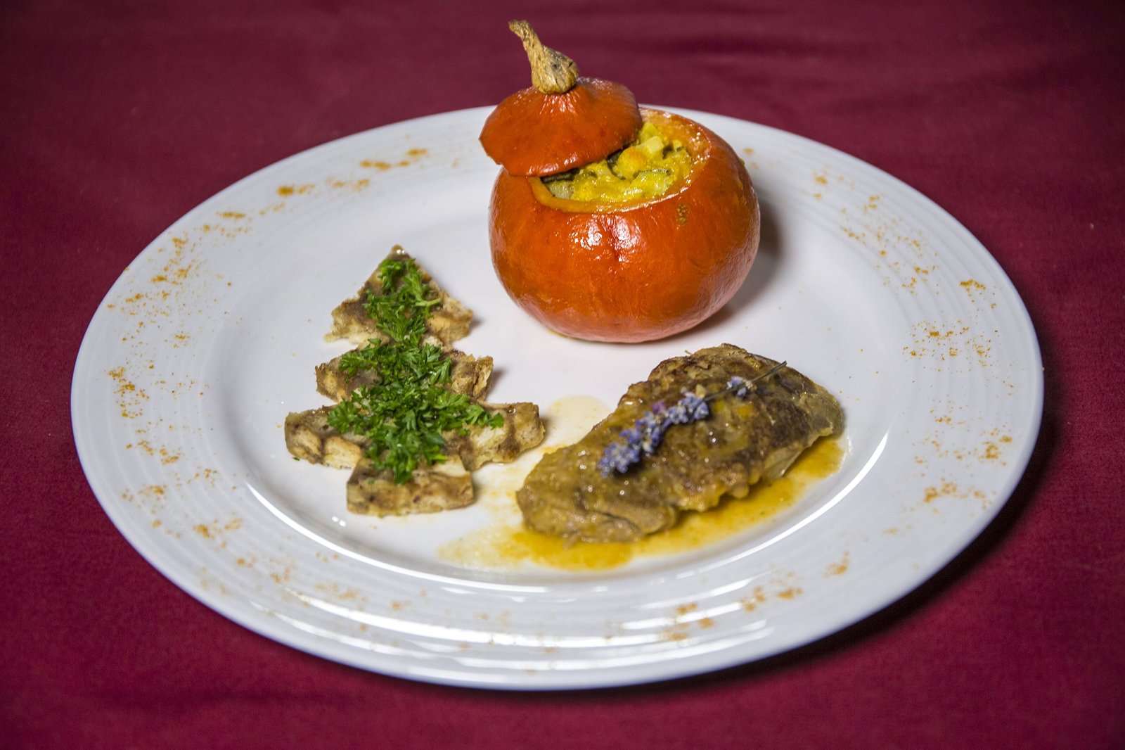 Das große WeihnachtsdinnerDie Hauptspeise: Zickleinbraten in Lavendel-, Rosmarin-Salzkruste mit Mini-Kürbis, gefüllt mit Datteln und Orangen an Weihnachts-Serviettenknödeln.Bild: © SWR/megaherz/Andreas Maluche