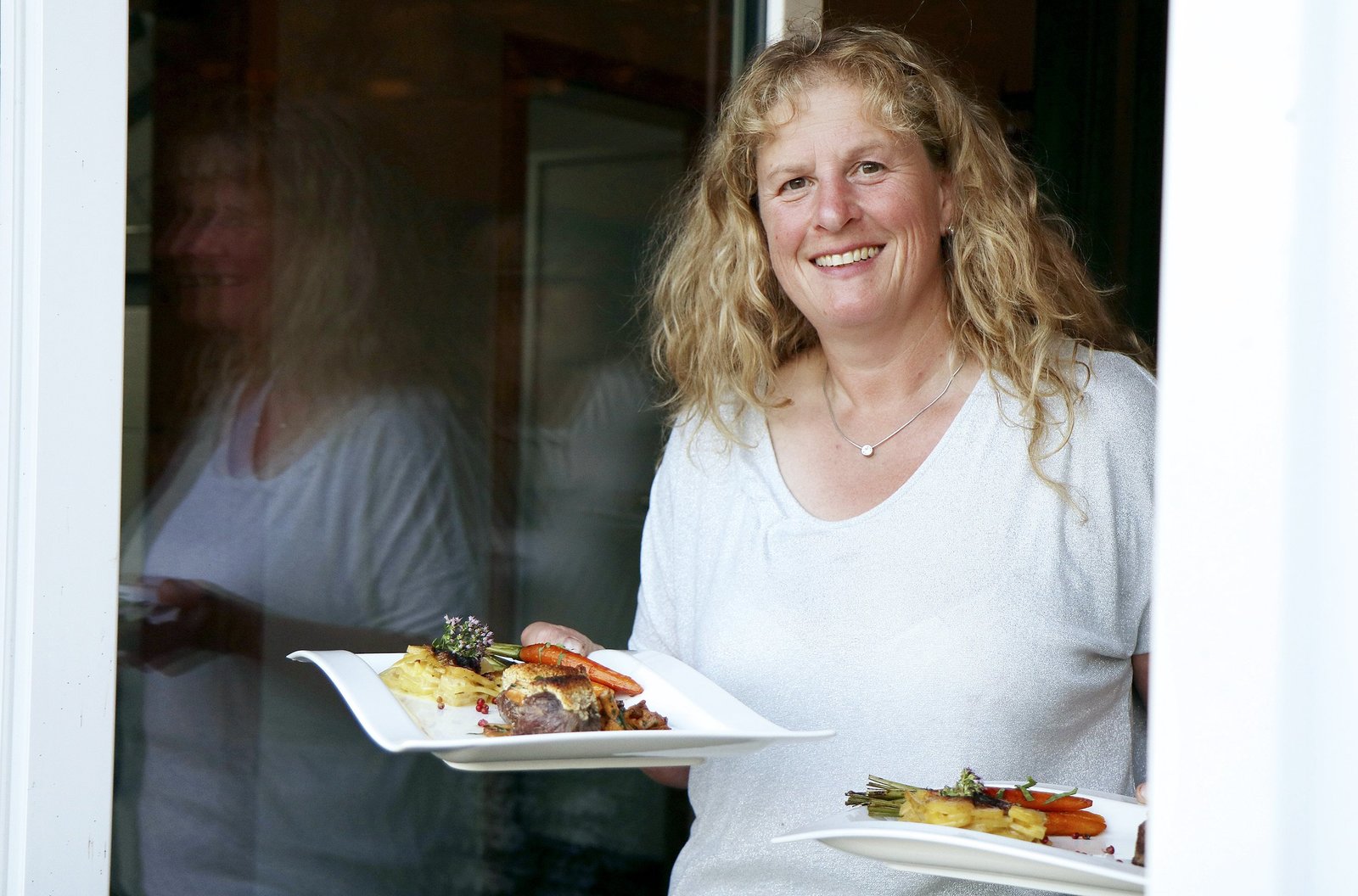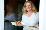 Zu Andrea Engel in den Landkreis Schwäbisch HallAndrea Engel, hier beim Servieren der Hauptspeise.Bild: © SWR/Elisabeth Kratzer