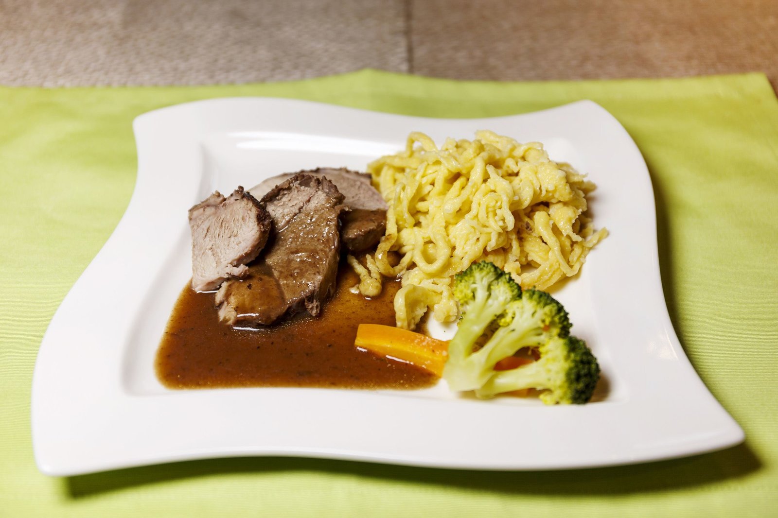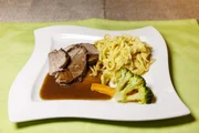 In den Nordschwarzwald zu Ursula BaßlerDie Hauptspeise: Lamm-Sauerbraten mit handgeschabten Spätzle und Gemüse .Bild: © SWR/megaherz/Andreas Maluche