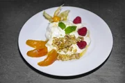 In den Saargau zu Silke FuchsenDie Nachspeise: Glasierte Aprikosen mit Joghurtcreme mit Himbeeren, Physalis und Walnüssen.Bild: © SWR/megaherz/Andreas Maluche