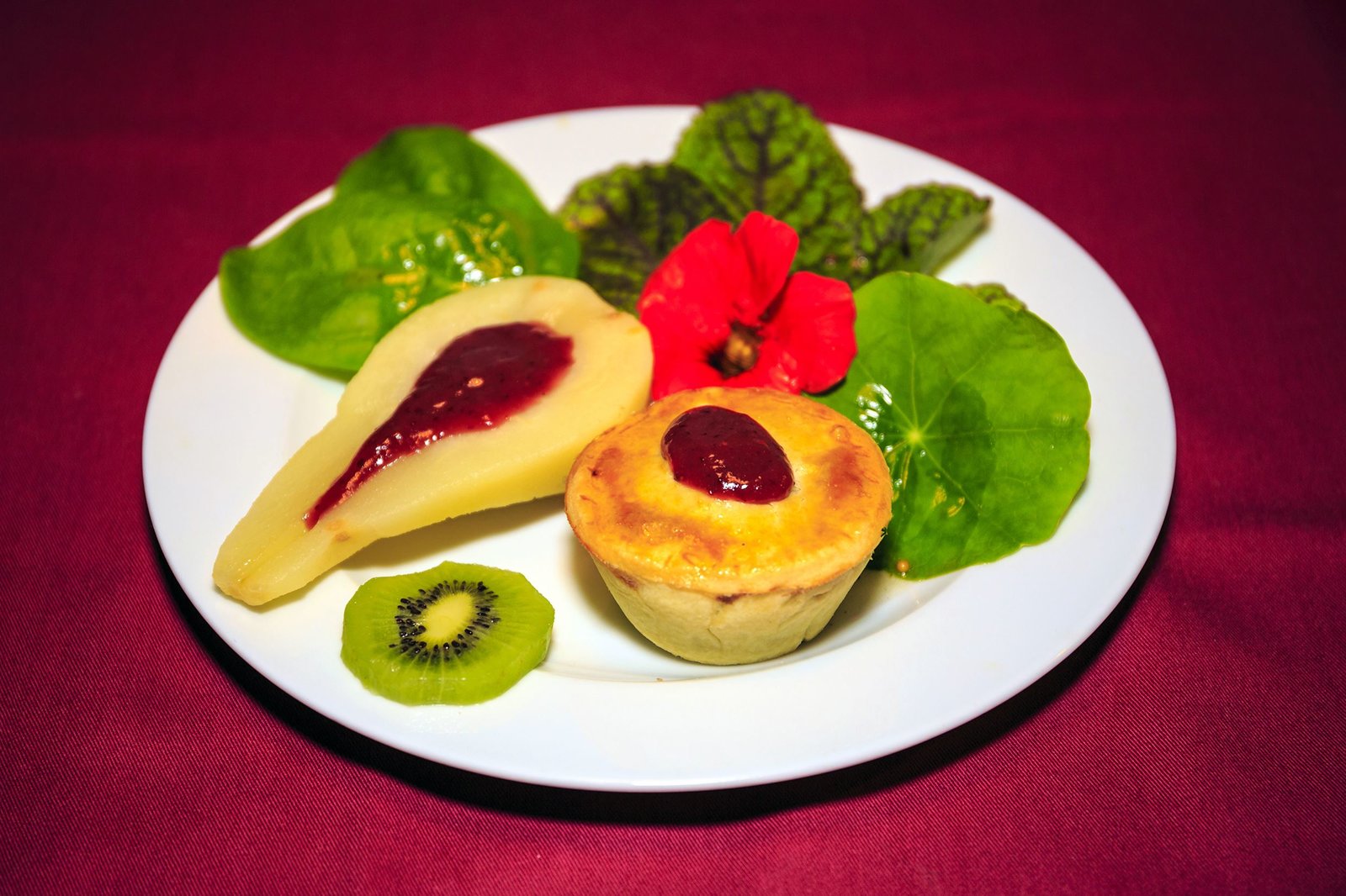 Eine kulinarische Winterreise: Christine Bernhard lädt auf ihr Weingut in der PfalzDie Vorspeise: Pastete im Blätterteig-Törtchen mit eingelegten, grünen Nüssen, Birne und Cumberland-Sauce und kleinem Gartensalat.Bild: © SWR/megaherz/Andreas Maluche