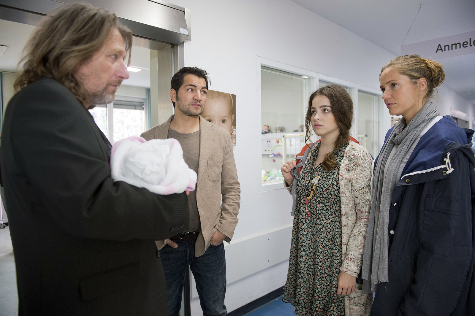 Willkommen im Leben (1)Lena Lorenz (Patricia Aulitzky, r.) hat Maria Brandner (Leslie-Vanessa Lill) ins Krankenhaus begleitet, wo sie auf Ersun (Bülent Sharif, 2.v.l.) und Marias Vater Kilian (Michael Fitz) treffen.Bild: © ZDF und Thomas R. Schumann
