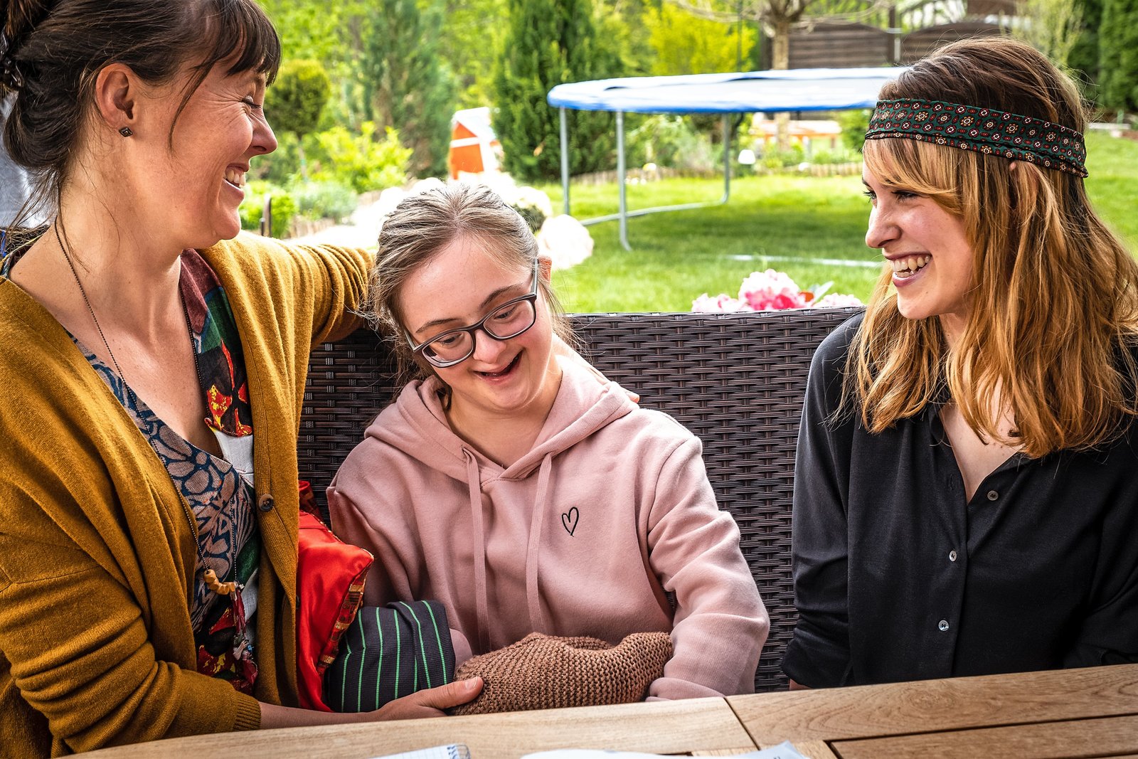 Außergewöhnlich einzigartig (1)Donna Mohrbutter (Malena Focht, M.) ist begeistert von Catharina Knuths (Victoria Schulz, r.) kleinem Sohn Sam. Auch ihre Mutter Saskia (Zora Thiessen, l.) lässt sich von Donnas Freude anstecken.Bild: © ORF 2