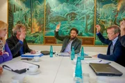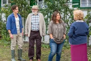 Zwei Väter (1)Dr. Schwammberger (Traute Hoess) vom Denkmalschutzamt wird von Leo (Fred Stillkrauth, 2.v.l.) über den Lorenzhof geführt. Eva (Eva Mattes) und Basti (Raban Bieling) sind alarmiert.Bild: © ZDF und Susanne Bernhard.