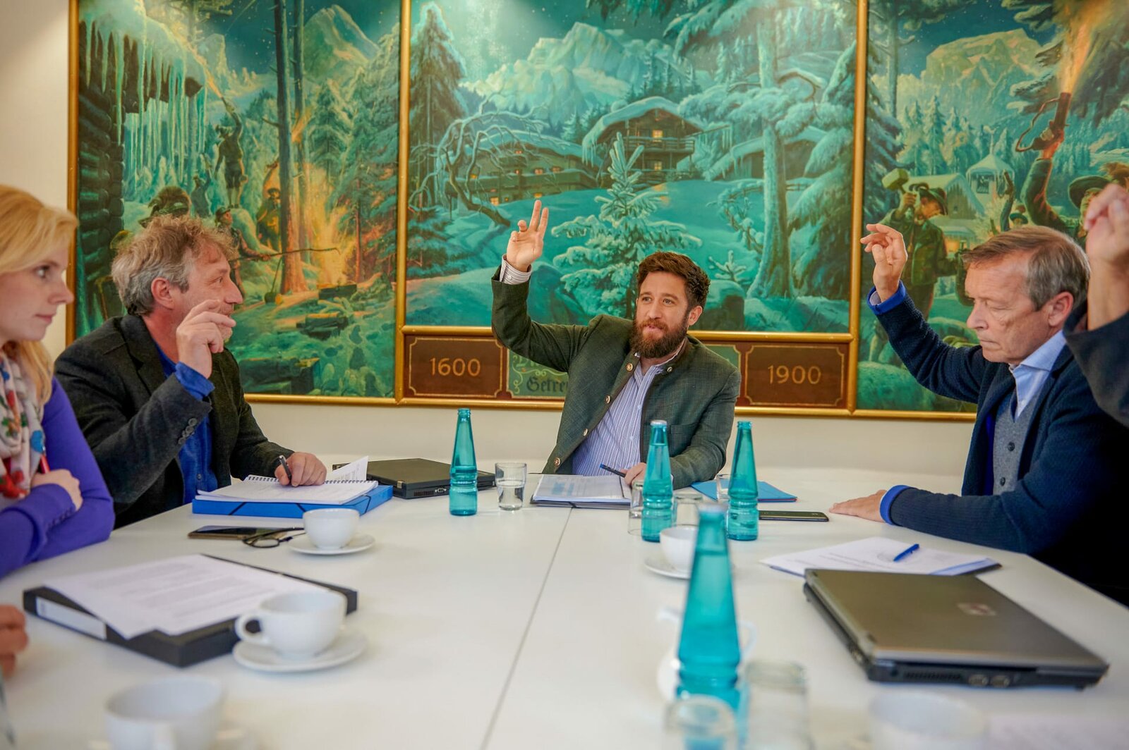 Hinter Gittern (1)Für Bürgermeister Schorschi Striebel (Sebastian Edtbauer, M.) zeichnet sich ein Erfolg für seinen Antrag ab, zumal sich Vinz Huber (Michael Roll, r.) zögernd seinem Vorschlag anschließt.Bild: © ORF/ZDF/Walter Wehner